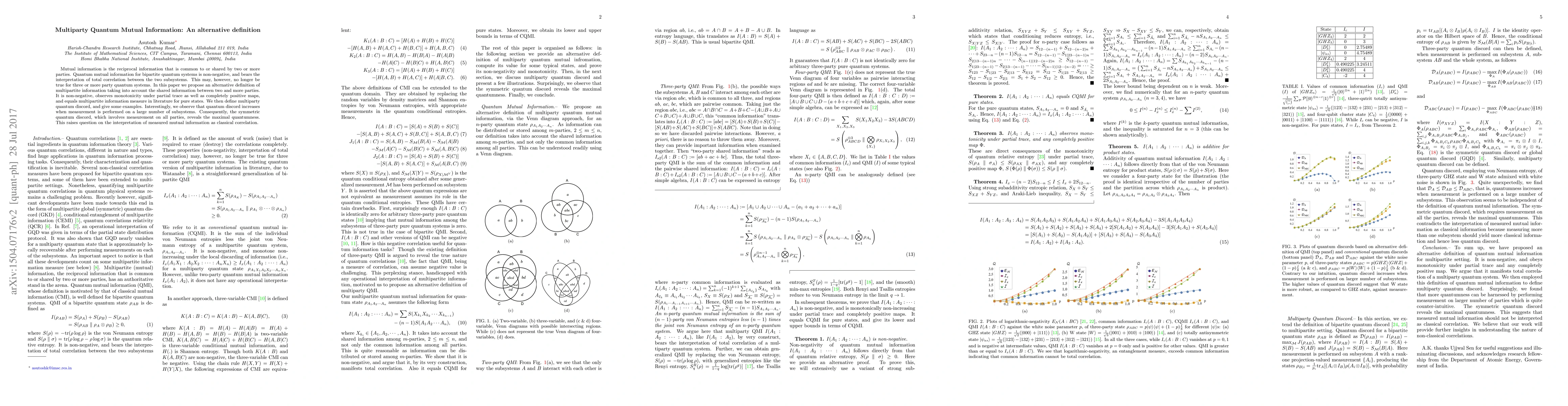 Mutual information is the reciprocal information that is common to or shared by two or more parties. Quantum mutual information for bipartite quantum systems is non-negative, and bears the interpretation of total correlation between the two subsystems. This may, however, no longer be true for three or more party quantum systems. In this paper, we propose an alternative definition of multipartite information taking into account the shared information between two and more parties. It is non-negative, observes monotonicity under partial trace as well as completely positive maps, and equals multipartite information measure in literature for pure states. We then define multiparty quantum discord, and give some examples. Interestingly, we observe that quantum discord increases when measurement is performed on a large number of subsystems. Consequently, the symmetric quantum discord, which involves measurement on all parties, reveals the maximal quantumness. This raises question on the interpretation of measured mutual information as classical correlation.