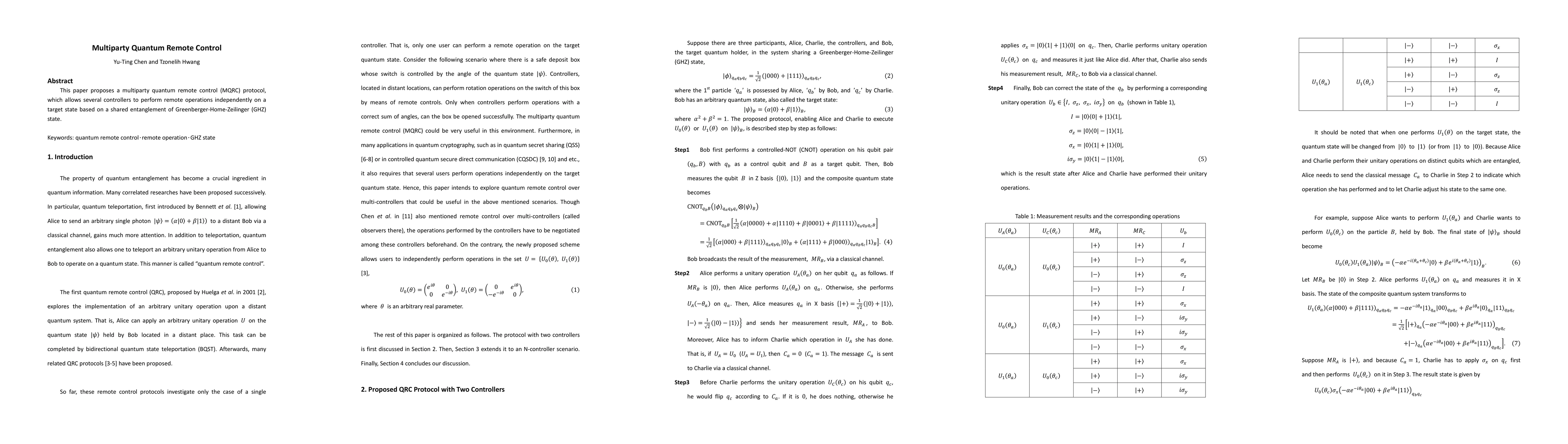 Summary: This paper introduces a multiparty quantum remote control protocol enabling multiple controllers to independently manipulate a target quantum state via shared Greenberger-Home-Zeilinger entanglement. The protocol enhances the flexibility and efficiency of quantum operations.