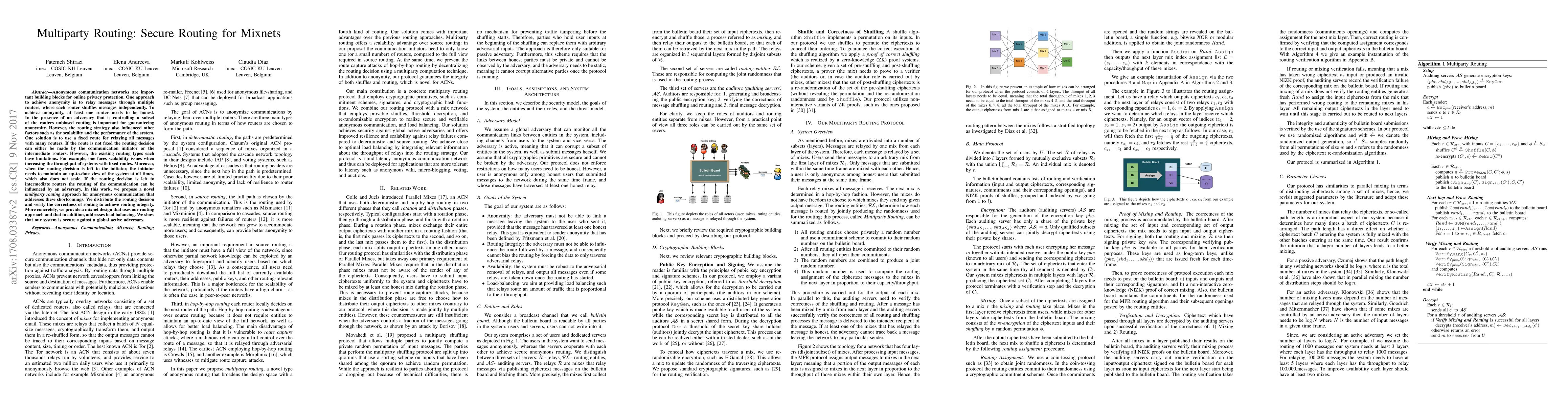 Anonymous communication networks are important building blocks for online privacy protection. One approach to achieve anonymity is to relay messages through multiple routers, where each router shuffles messages independently. To achieve anonymity, at least one router needs to be honest. In the presence of an adversary that is controlling a subset of the routers unbiased routing is important for guaranteeing anonymity. However, the routing strategy also influenced other factors such as the scalability and the performance of the system. One solution is to use a fixed route for relaying all messages with many routers. If the route is not fixed the routing decision can either be made by the communication initiator or the intermediate routers. However, the existing routing types each have limitations. For example, one faces scalability issues when increasing the throughput of systems with fixed routes. Moreover, when the routing decision is left to the initiator, the initiator needs to maintain an up-to-date view of the system at all times, which also does not scale. If the routing decision is left to intermediate routers the routing of the communication can be influenced by an adversary. In this work, we propose a novel multiparty routing approach for anonymous communication that addresses these shortcomings. We distribute the routing decision and verify the correctness of routing to achieve routing integrity. More concretely, we provide a mixnet design that uses our routing approach and that in addition, addresses load balancing. We show that our system is secure against a global active adversary.