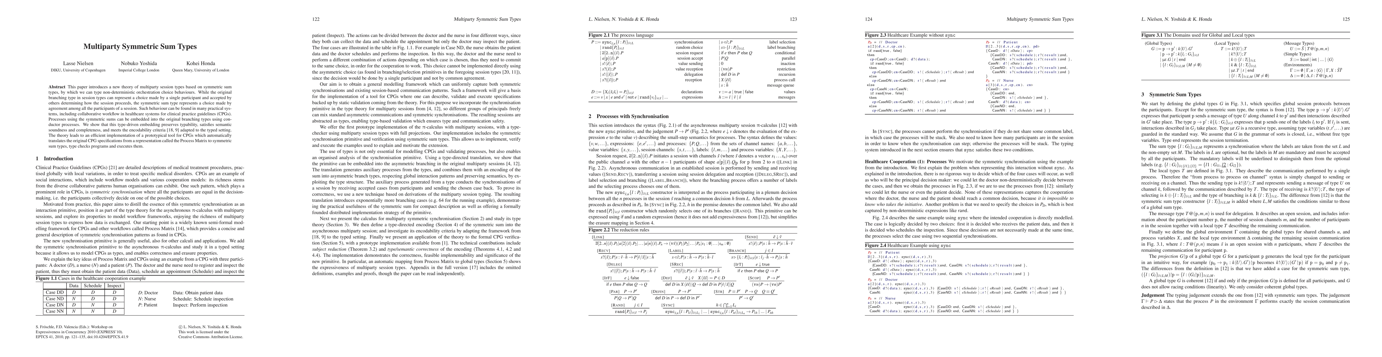 This paper introduces a symmetric sum type primitive in multiparty session types, enabling formal verification of complex distributed workflow protocols.
