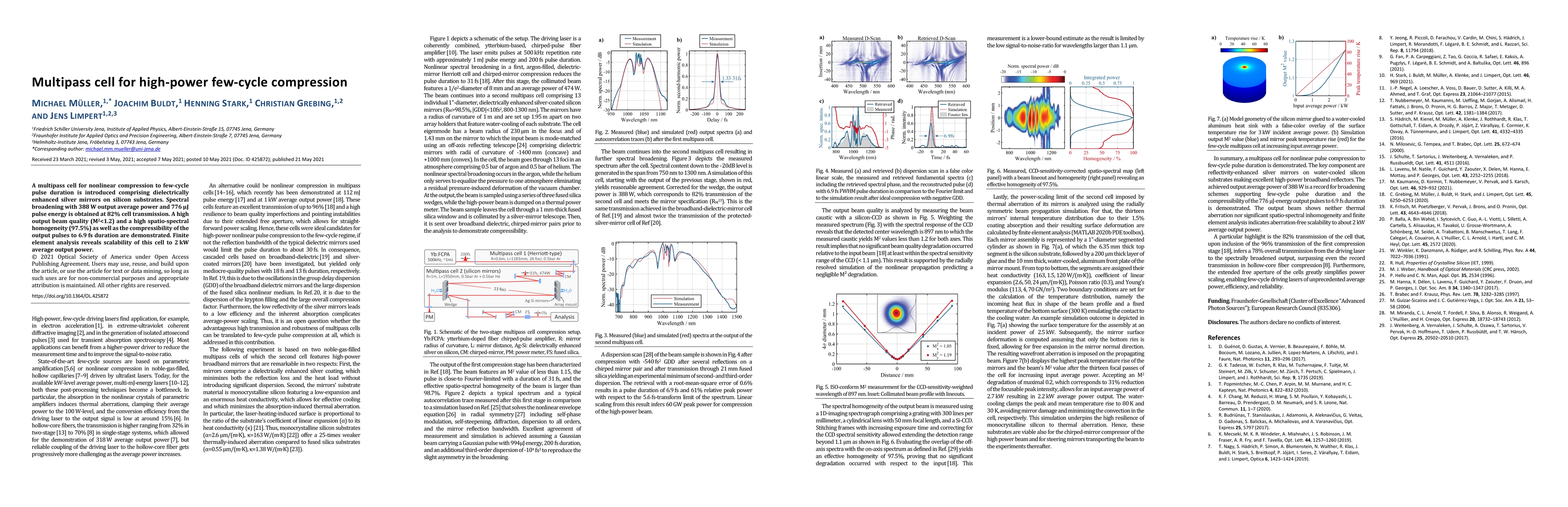 This paper introduces a multipass cell using dielectrically enhanced silver mirrors for nonlinear compression of high-power pulses to few-cycle durations, achieving 388 W average power and 6.9 fs pulse duration with high beam quality and homogeneity. Finite element analysis suggests scalability to 2 kW average output power.