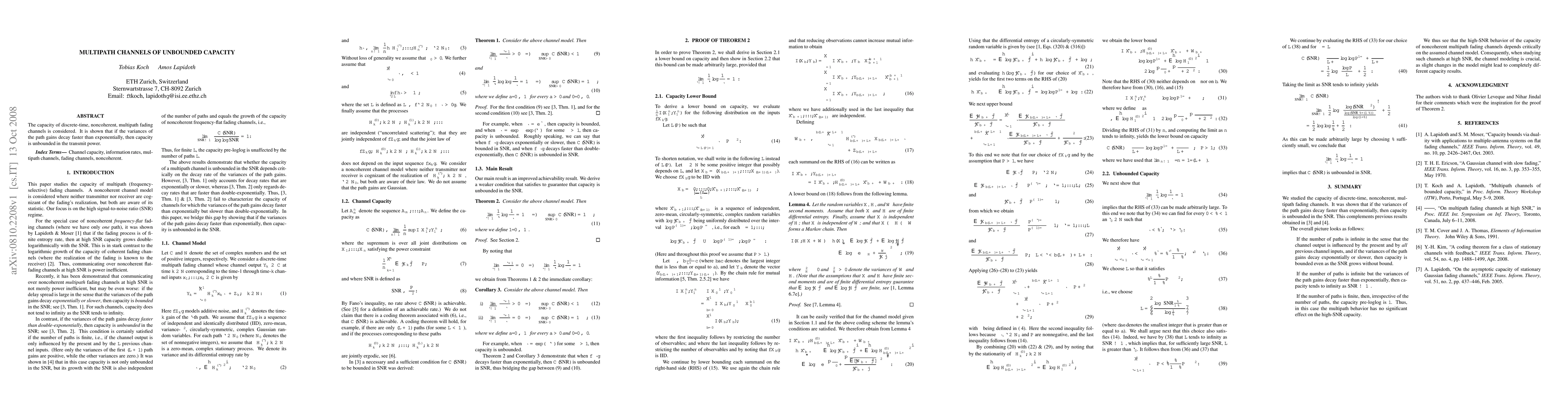 Summary: This paper explores the capacity of discrete-time, noncoherent, multipath fading channels and demonstrates that if the variances of the path gains decay faster than exponentially, the channel's capacity can be unbounded with increasing transmit power.