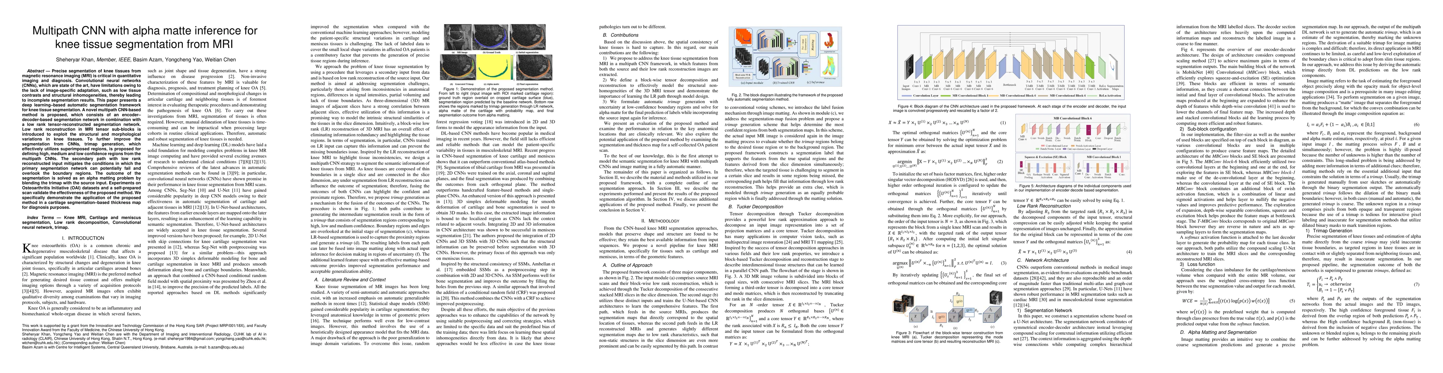 This paper proposes a multipath CNN framework for precise knee tissue segmentation from MRI, addressing limitations of traditional CNNs by incorporating low rank tensor reconstruction and alpha matte inference to enhance segmentation accuracy, validated through Osteoarthritis Initiative datasets and self-prepared scans. The method improves boundary region detection and is particularly useful for cartilage thickness mapping in diagnosis.
