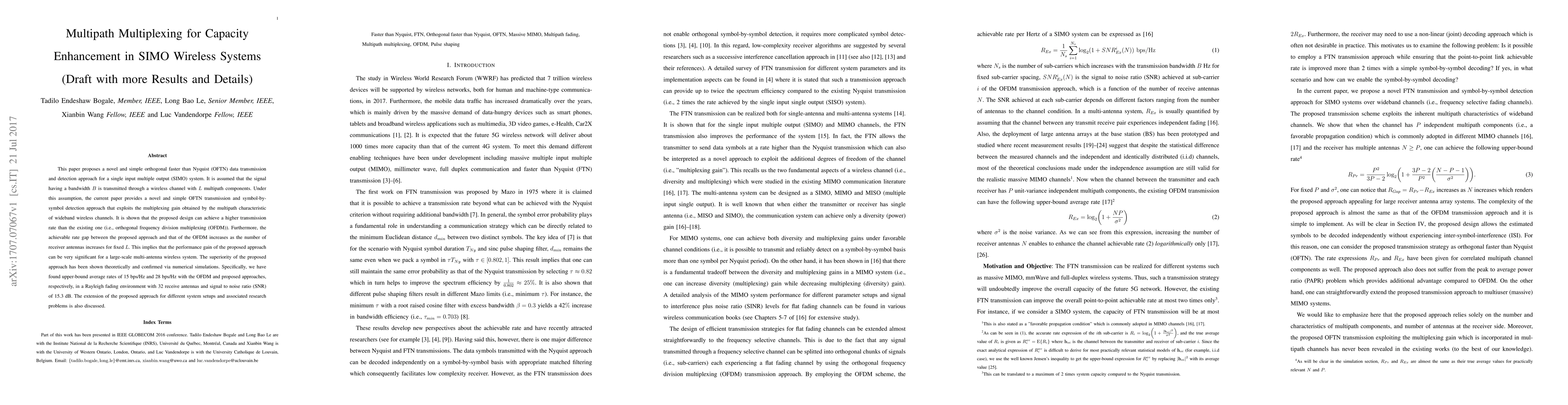 This paper proposes a novel and simple orthogonal faster than Nyquist (OFTN) data transmission and detection approach for a single input multiple output (SIMO) system. It is assumed that the signal having a bandwidth $B$ is transmitted through a wireless channel with $L$ multipath components. Under this assumption, the current paper provides a novel and simple OFTN transmission and symbol-by-symbol detection approach that exploits the multiplexing gain obtained by the multipath characteristic of wideband wireless channels. It is shown that the proposed design can achieve a higher transmission rate than the existing one (i.e., orthogonal frequency division multiplexing (OFDM)). Furthermore, the achievable rate gap between the proposed approach and that of the OFDM increases as the number of receiver antennas increases for a fixed value of $L$. This implies that the performance gain of the proposed approach can be very significant for a large-scale multi-antenna wireless system. The superiority of the proposed approach is shown theoretically and confirmed via numerical simulations. {Specifically, we have found {upper-bound average} rates of 15 bps/Hz and 28 bps/Hz with the OFDM and proposed approaches, respectively, in a Rayleigh fading channel with 32 receive antennas and signal to noise ratio (SNR) of 15.3 dB. The extension of the proposed approach for different system setups and associated research problems is also discussed.