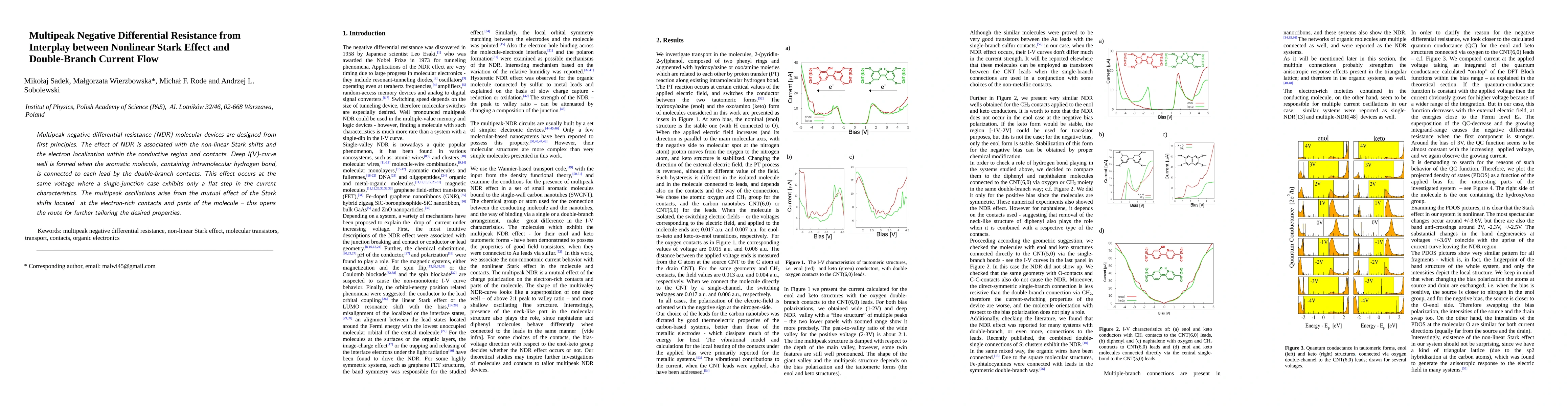 Multipeak negative differential resistance (NDR) molecular devices are designed from first principles. The effect of NDR is associated with the non-linear Stark shifts and the electron localization within the conductive region and contacts. Deep I(V)-curve well is formed when the aromatic molecule, containing intramolecular hydrogen bond, is connected to each lead by the double-branch contacts. This effect occurs at the same voltage where a single-junction case exhibits only a flat step in the current characteristics. The multipeak oscillations arise from the mutual effect of the Stark shifts located at the electron-rich contacts and parts of the molecule - this opens the route for further tailoring the desired properties.