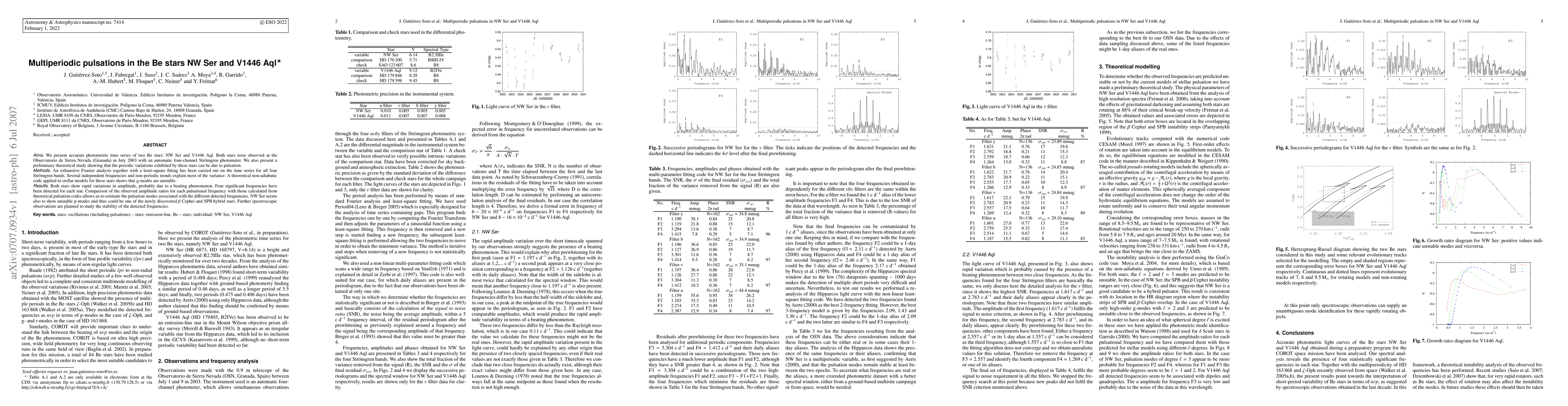 Aims: We present accurate photometric time series of two Be stars: NW Ser and V1446 Aql. Both stars were observed at the Observatorio de Sierra Nevada (Granada) in July 2003 with an automatic four-channel Str\"omgren photometer. We also present a preliminary theoretical study showing that the periodic variations exhibited by these stars can be due to pulsation. Methods: An exhaustive Fourier analysis together with a least-square fitting has been carried out on the time series for all four Str\"omgren bands. Several independent frequencies and non-periodic trends explain most of the variance. A theoretical non-adiabatic code applied to stellar models for these stars shows that g-modes are unstable. Results: Both stars show rapid variations in amplitude, probably due to a beating phenomenon. Four significant frequencies have been detected for each star. Comparison of the observed amplitude ratios for each pulsational frequency with those calculated from theoretical pulsation codes allows us to estimate the pulsation modes associated with the different detected frequencies. NW Ser seems also to show unstable p-modes and thus could be one of the newly discovered $\beta$ Cephei and SPB hybrid stars. Further spectroscopic observations are planned to study the stability of the detected frequencies.