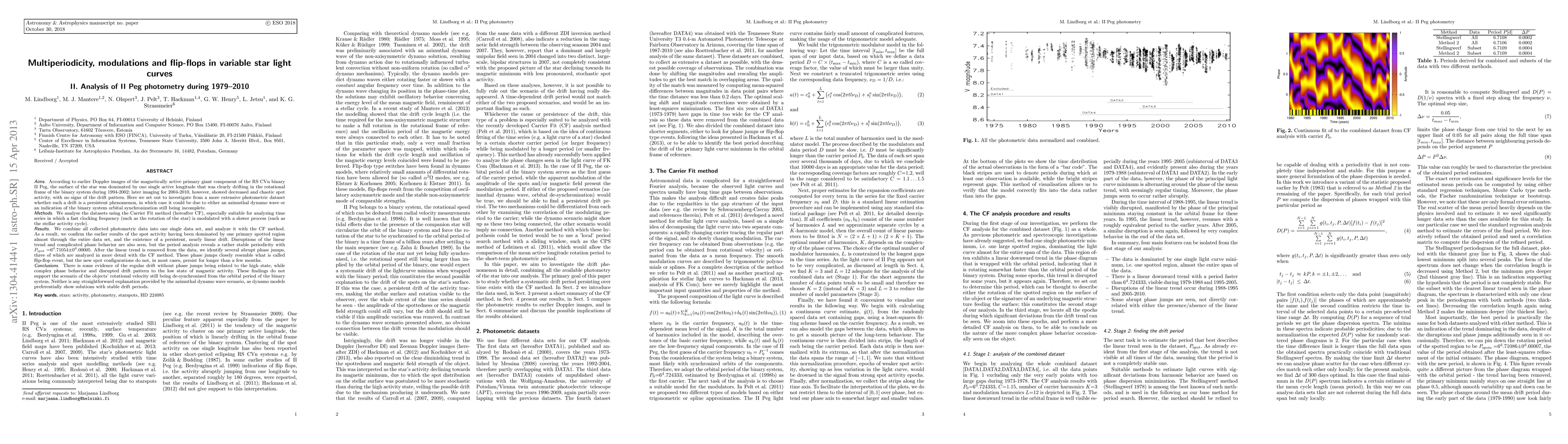 According to earlier Doppler images of the magnetically active primary giant component of the RS CVn binary II Peg, the surface of the star was dominated by one single active longitude that was clearly drifting in the rotational frame of the binary system during 1994-2002; later imaging for 2004-2010, however, showed decreased and chaotic spot activity, with no signs of the drift pattern. Here we set out to investigate from a more extensive photometric dataset whether such a drift is a persistent phenomenon, in which case it could be due to either an azimuthal dynamo wave or an indication of the binary system orbital synchronization still being incomplete. We analyse the datasets using the Carrier Fit method (hereafter CF), especially suitable for analyzing time series in which a fast clocking frequency (such as the rotation of the star) is modulated with a slower process (such as the stellar activity cycle). We combine all collected photometric data into one single data set, and analyze it with the CF method. As a result, we confirm the earlier results of the spot activity having been dominated by one primary spotted region almost through the entire data set, and the existence of a persistent, nearly linear drift. Disruptions of the linear trend and complicated phase behavior are also seen, but the period analysis reveals a rather stable periodicity with P(spot)=6.71054d plus/minus 0.00005d. After the linear trend is removed from the data, we identify several abrupt phase jumps, three of which are analyzed in more detail with the CF method. These phase jumps closely resemble what is called flip-flop event, but the new spot configurations do not, in most cases, persist for longer than a few months.