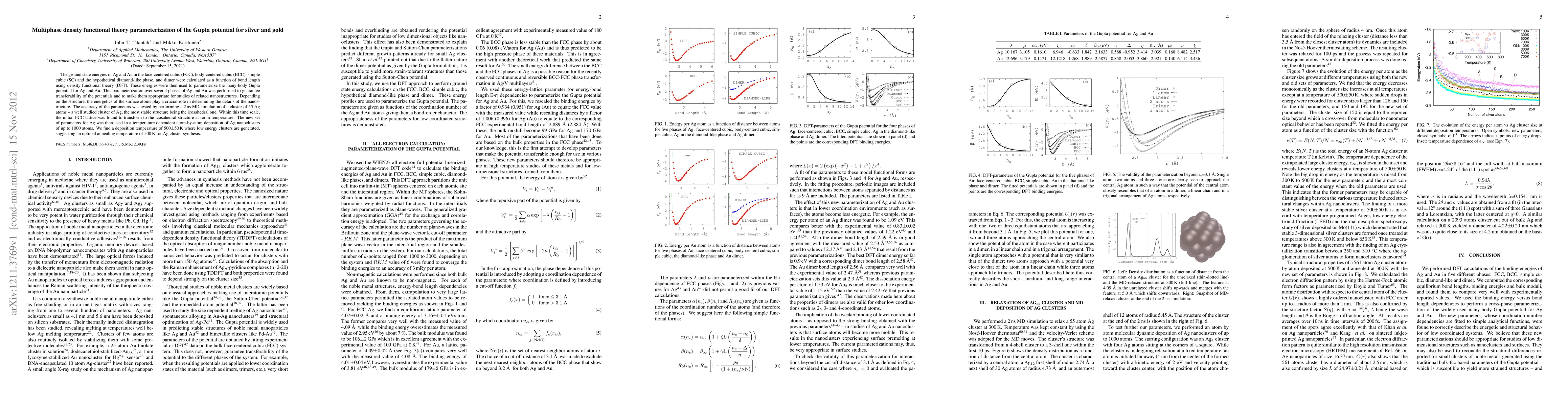 The ground state energies of Ag and Au in the face-centered cubic (FCC), body-centered cubic (BCC), simple cubic (SC) and the hypothetical diamond-like phase, and dimer were calculated as a function of bond length using density functional theory (DFT). These energies were then used to parameterize the many-body Gupta potential for Ag and Au. This parameterization over several phases of Ag and Au was performed to guarantee transferability of the potentials and to make them appropriate for studies of related nanostructures. Depending on the structure, the energetics of the surface atoms play a crucial role in determining the details of the nanostructure. The accuracy of the parameters was tested by performing a 2 ns MD simulation of a cluster of 55 Ag atoms -- a well studied cluster of Ag, the most stable structure being the icosahedral one. Within this time scale, the initial FCC lattice was found to transform to the icosahedral structure at room temperature. The new set of parameters for Ag was then used in a temperature dependent atom-by-atom deposition of Ag nanoclusters of up to 1000 atoms. We find a deposition temperature of 500 $\pm$50 K where low energy clusters are generated, suggesting an optimal annealing temperature of 500 K for Ag cluster synthesis.