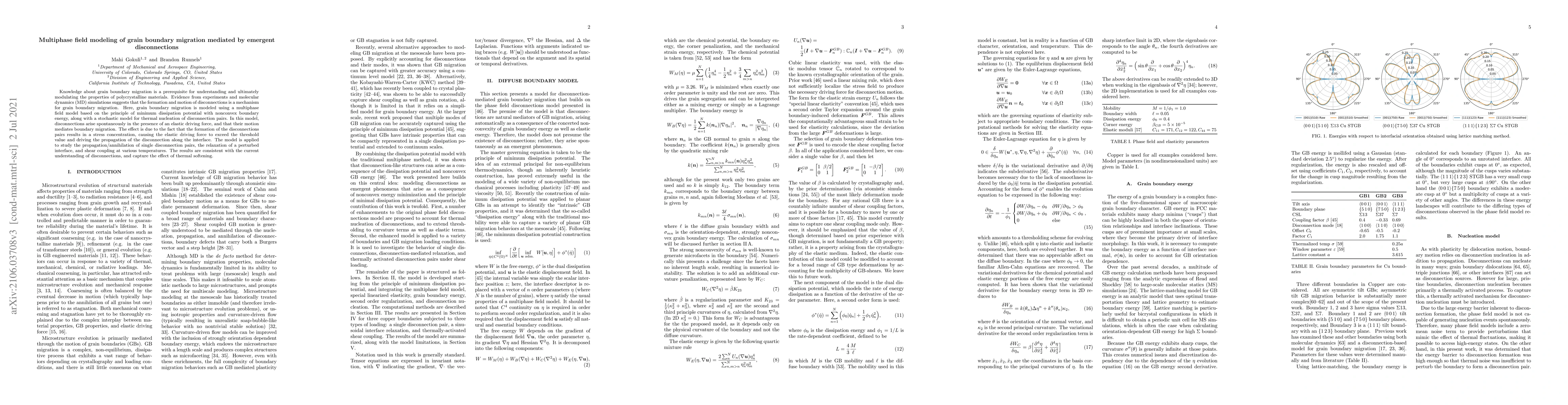 This paper models grain boundary migration using a multiphase field approach that incorporates emergent disconnections, demonstrating how disconnection pairs form and move to drive boundary migration. The model successfully captures the propagation and annihilation of disconnections, and aligns with experimental and simulation findings on the role of disconnections in thermal softening.