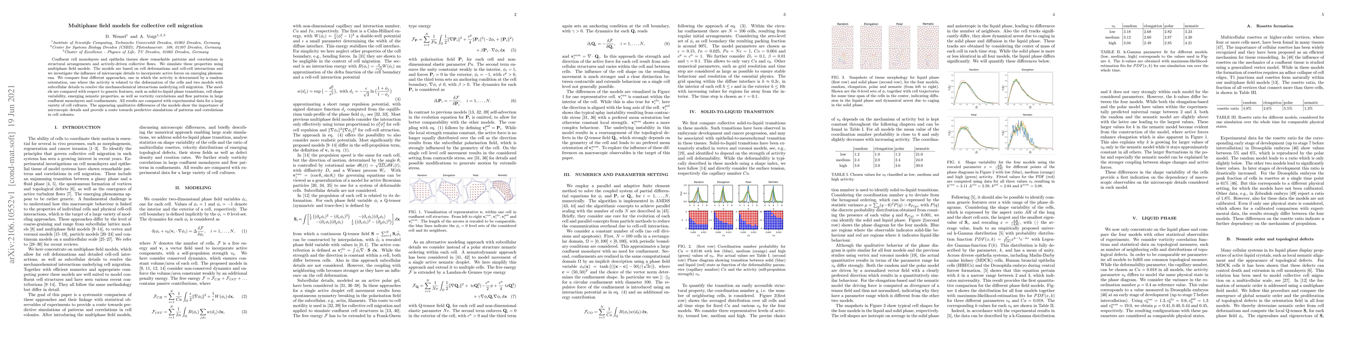 This paper explores multiphase field models to simulate collective cell migration in confluent cell monolayers, comparing four different approaches based on cell deformations and interactions. The study highlights the importance of microscopic details in predicting patterns and correlations in cell colonies, validated through comparisons with experimental data.