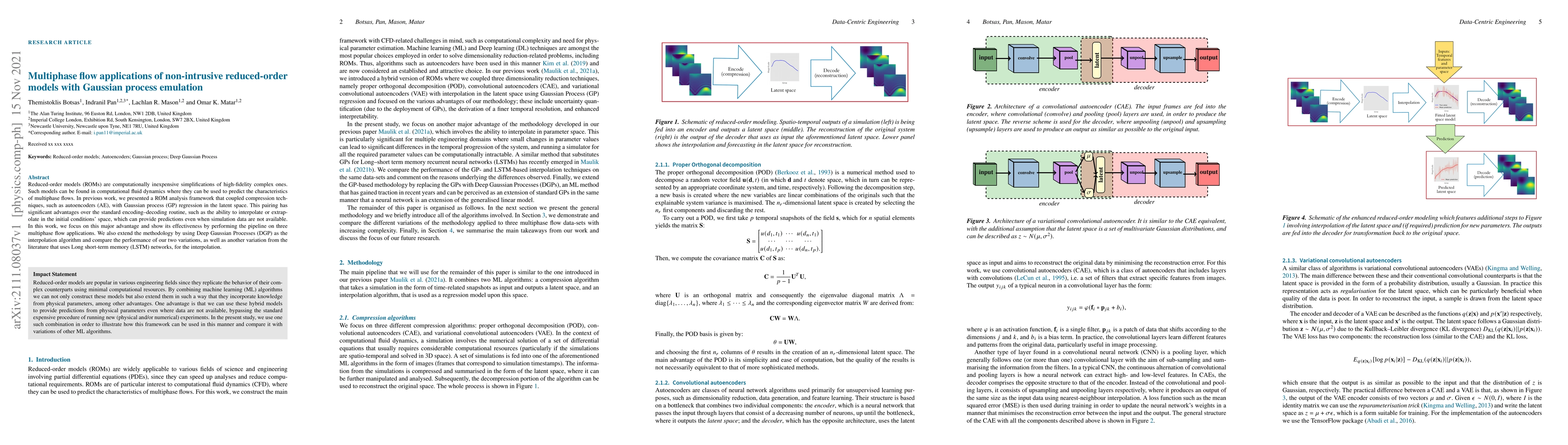 This paper explores the application of non-intrusive reduced-order models (ROMs) with Gaussian process emulation for predicting multiphase flow characteristics. It demonstrates the effectiveness of coupling autoencoders with Gaussian processes for interpolation and extrapolation, and compares this approach with Deep Gaussian Processes and LSTM networks.