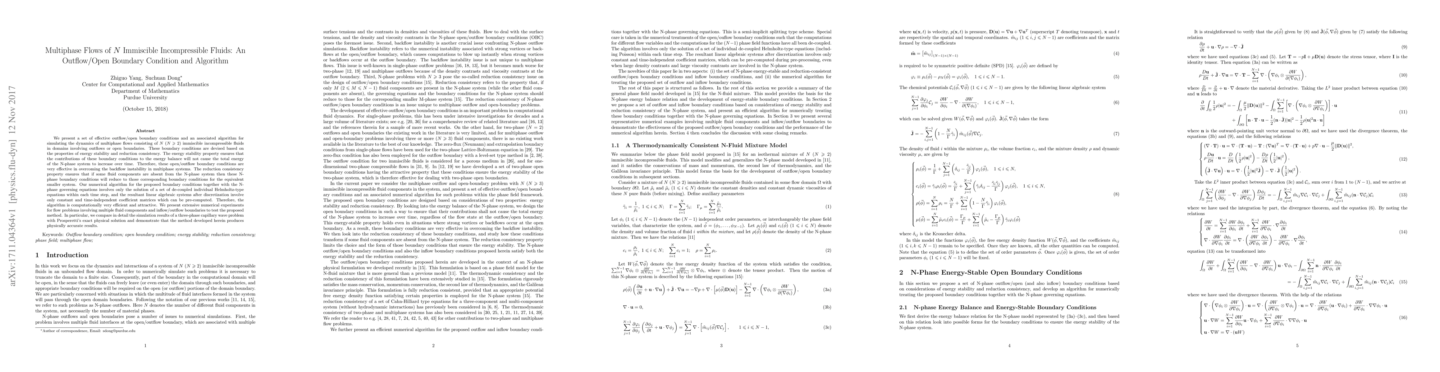This paper introduces effective outflow/open boundary conditions and an algorithm for simulating multiphase flows of $N$ immiscible incompressible fluids, ensuring energy stability and reduction consistency. The proposed method efficiently solves decoupled Helmholtz-type equations, demonstrating accurate results in numerical experiments, particularly in a three-phase capillary wave problem.