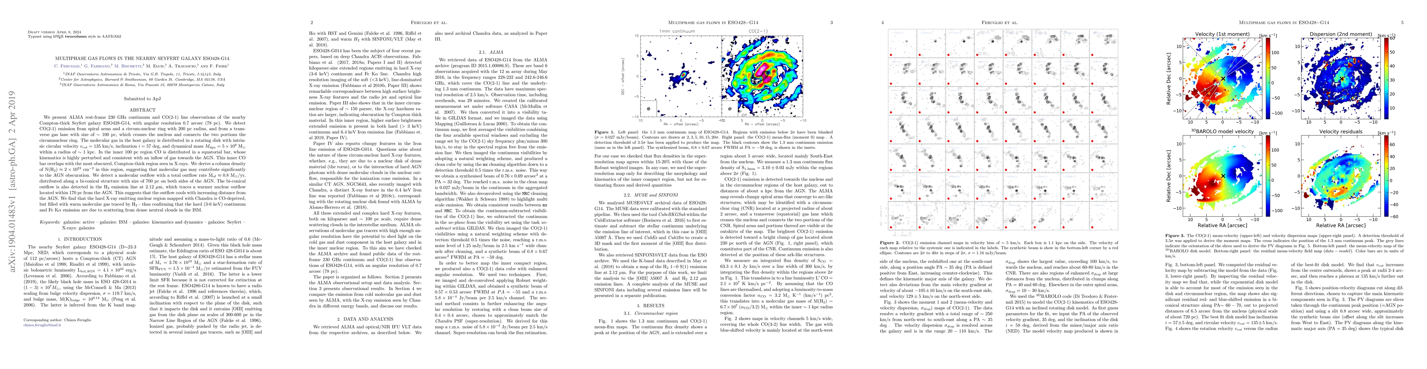 We present ALMA rest-frame 230 GHz continuum and CO(2-1) line observations of the nearby Compton-thick Seyfert galaxy ESO428-G14, with angular resolution 0.7 arcsec (78 pc). We detect CO(2-1) emission from spiral arms and a circum-nuclear ring with 200 pc radius, and from a transverse gas lane with size of $\sim100$ pc, which crosses the nucleus and connects the two portions the circumnuclear ring. The molecular gas in the host galaxy is distributed in a rotating disk with intrinsic circular velocity $v_{rot}=135$ km/s, inclination $i=57$ deg, and dynamical mass $M_{dyn }=5\times 10^9~\rm M_{\odot}$ within a radius of $\sim 1$ kpc. In the inner 100 pc region CO is distributed in a equatorial bar, whose kinematics is highly perturbed and consistent with an inflow of gas towards the AGN. This inner CO bar overlaps with the most obscured, Compton-thick region seen in X-rays. We derive a column density of $\rm N(H_2) \approx 2\times10^{23}~ cm^{-2}$ in this region, suggesting that molecular gas may contribute significantly to the AGN obscuration. We detect a molecular outflow with a total outflow rate $\rm \dot M_{of}\approx 0.8~M_{\odot}/yr$, distributed along a bi-conical structure with size of $700$ pc on both sides of the AGN. The bi-conical outflow is also detected in the $\rm H_2$ emission line at 2.12 $\mu$m, which traces a warmer nuclear outflow located within 170 pc from the AGN. This suggests that the outflow cools with increasing distance from the AGN. We find that the hard X-ray emitting nuclear region mapped with Chandra is CO-deprived, but filled with warm molecular gas traced by $\rm H_2$ - thus confirming that the hard (3-6 keV) continuum and Fe K$\alpha$ emission are due to scattering from dense neutral clouds in the ISM.