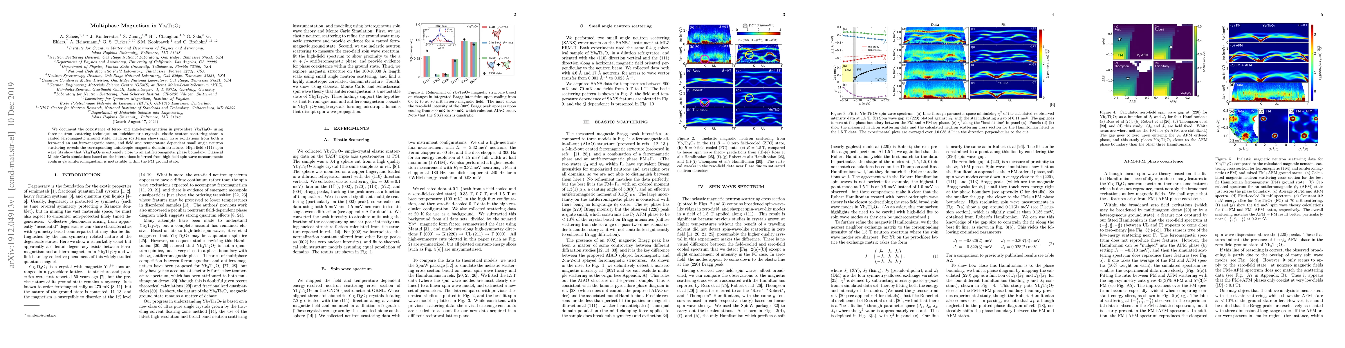 We document the coexistence of ferro- and anti-ferromagnetism in pyrochlore $\rm Yb_2Ti_2O_7$ using three neutron scattering techniques on stoichiometric crystals: elastic neutron scattering shows a canted ferromagnetic ground state, neutron scattering shows spin wave excitations from both a ferro-and an antiferro-magnetic state, and field and temperature dependent small angle neutron scattering reveals the corresponding anisotropic magnetic domain structure. High-field $\langle 111 \rangle$ spin wave fits show that $\rm Yb_2Ti_2O_7$ is extremely close to an antiferromagnetic phase boundary. Classical Monte Carlo simulations based on the interactions inferrred from high field spin wave measurements confirm $\psi_2$ antiferromagnetism is metastable within the FM ground state.