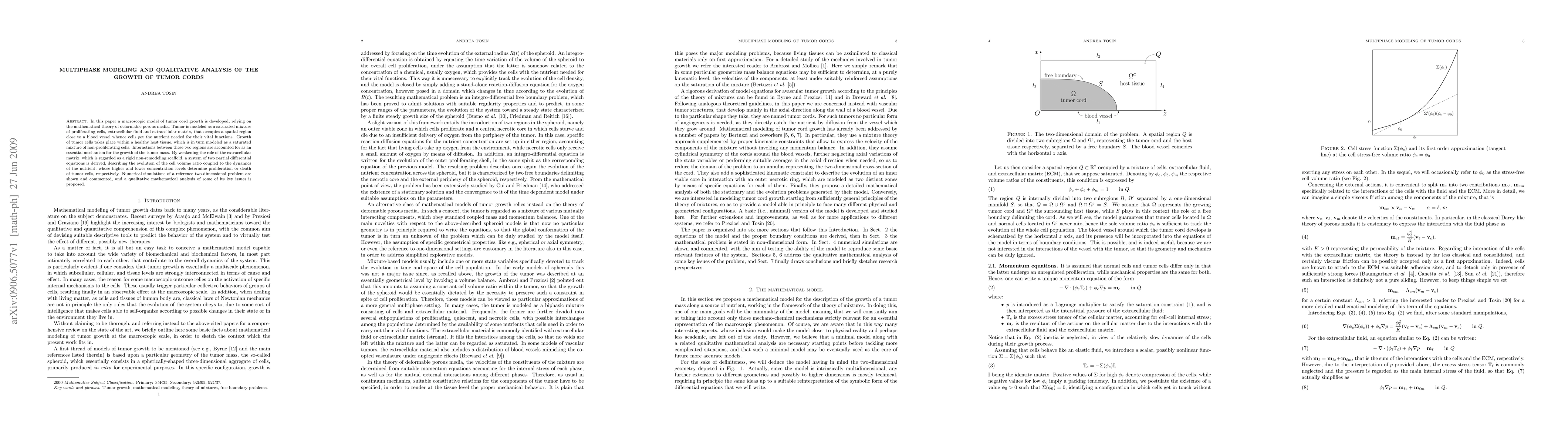 This paper develops a macroscopic model for tumor cord growth using deformable porous media theory, focusing on interactions between proliferating tumor cells and non-proliferating host tissue. It derives a system of partial differential equations to describe the evolution of cell volume ratio and nutrient dynamics, with numerical simulations and qualitative analysis provided.
