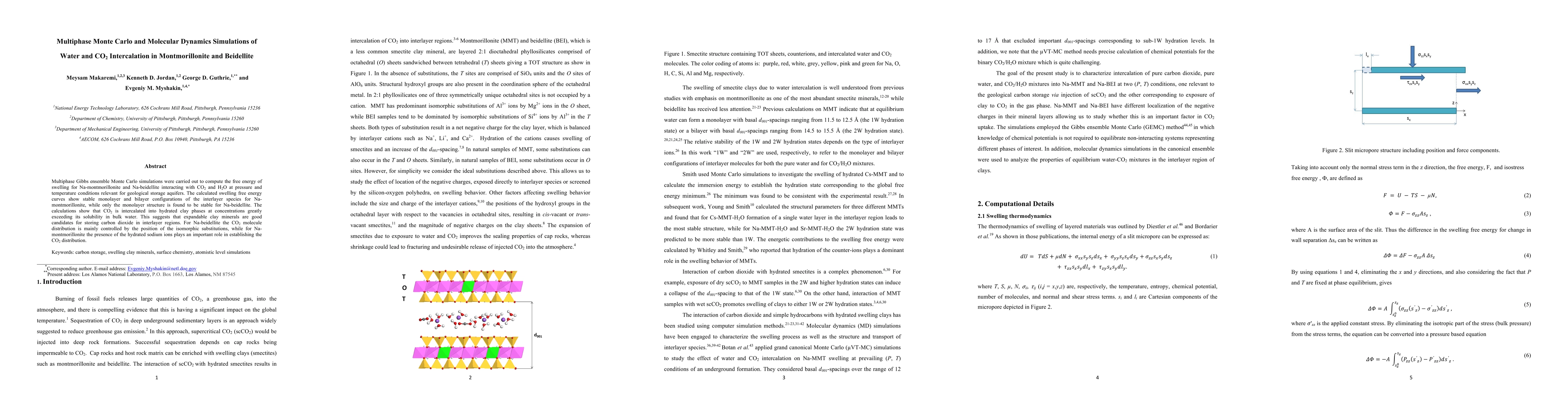 This study uses multiphase Monte Carlo simulations to analyze the free energy of swelling for Na-montmorillonite and Na-beidellite with CO2 and H2O, revealing stable monolayer and bilayer configurations for montmorillonite and only a stable monolayer for beidellite. CO2 intercalation at high concentrations suggests expandable clay minerals are effective for carbon dioxide storage.