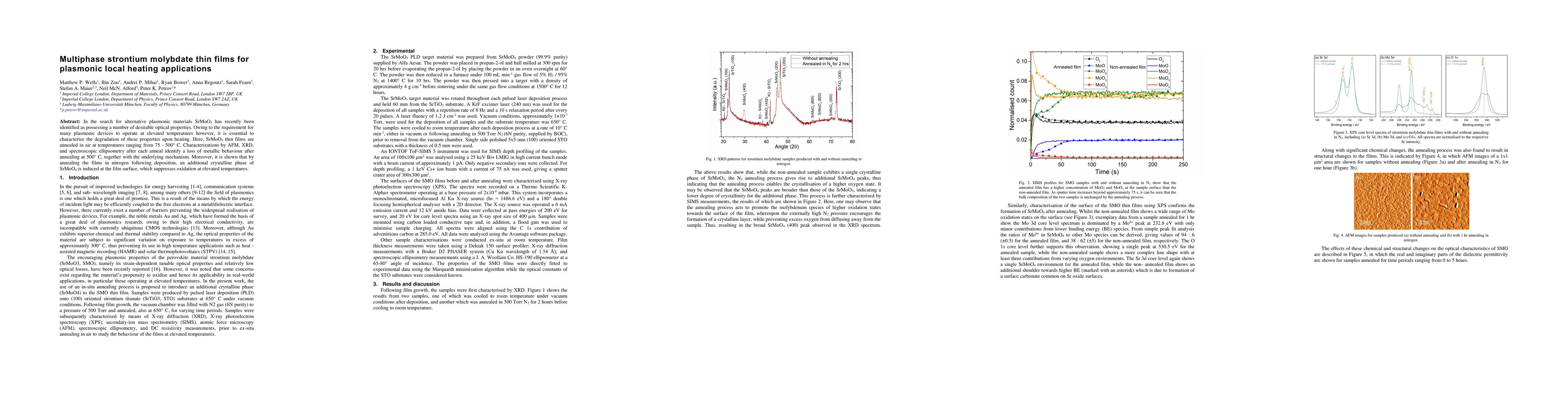 This study investigates the optical properties of strontium molybdate (SrMoO3) thin films for plasmonic applications, finding that annealing in air degrades metallic behavior at 500°C. Annealing in nitrogen induces a SrMoO4 phase that suppresses oxidation and enhances stability at high temperatures.