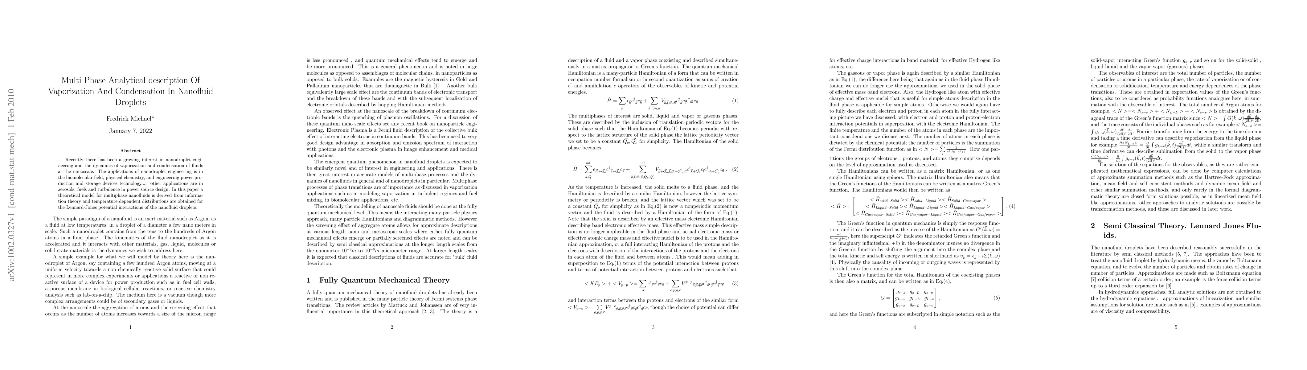 This paper develops a multiphase theory for Lennard-Jones nanofluids using an information theoretic approach, analogous to quantum mechanical phase transition theories, to model the dynamics of vaporization and condensation in nanodroplets. Analytic solutions for the least biased particle distributions are derived.