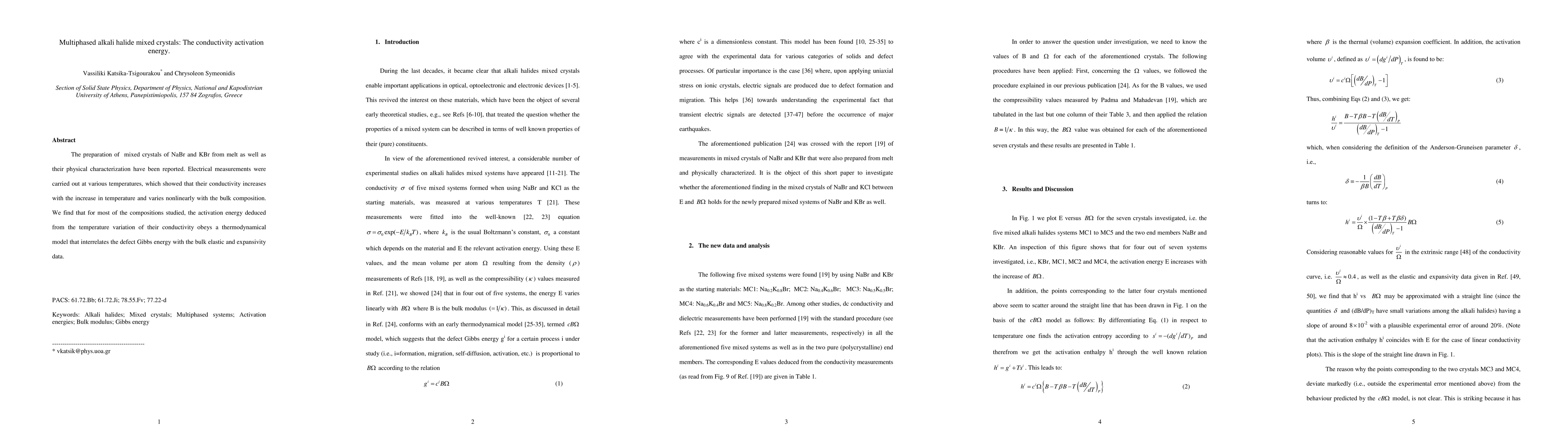 The preparation of mixed crystals of NaBr and KBr from melt as well as their physical characterization have been reported. Electrical measurements were carried out at various temperatures, which showed that their conductivity increases with the increase in temperature and varies nonlinearly with the bulk composition. We find that for most of the compositions studied, the activation energy deduced from the temperature variation of their conductivity obeys a thermodynamical model that interrelates the defect Gibbs energy with the bulk elastic and expansivity data.