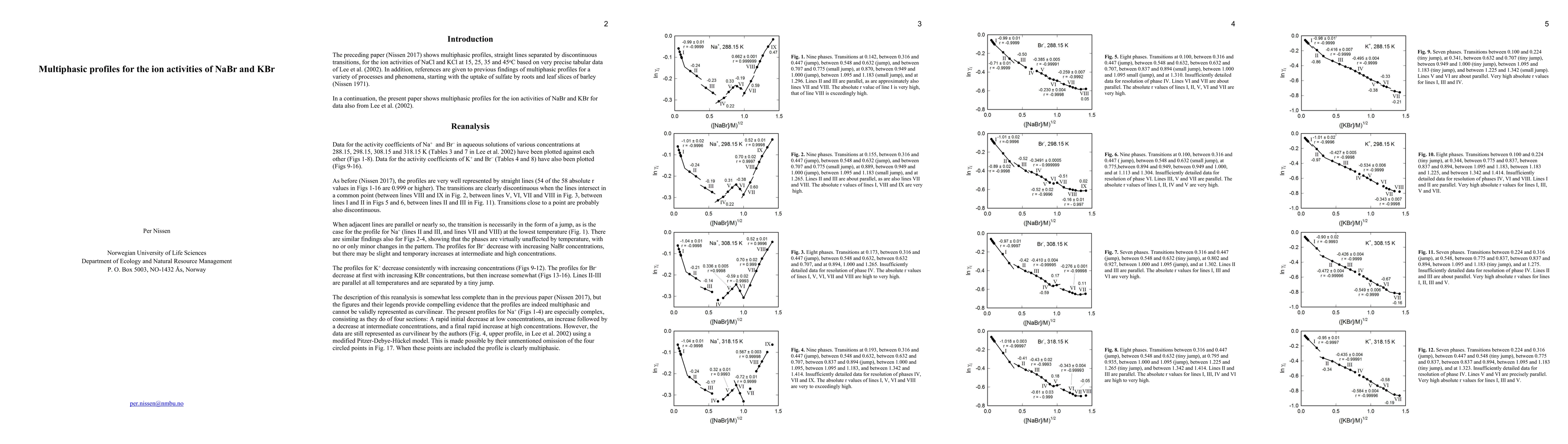 The preceding paper (Nissen 2017) shows multiphasic profiles, straight lines separated by discontinuous transitions, for the ion activities of NaCl and KCl at 15, 25, 35 and 45oC based on very precise tabular data of Lee et al. (2002). In addition, references are given to previous findings of multiphasic profiles for a variety of processes and phenomena, starting with the uptake of sulfate by roots and leaf slices of barley (Nissen 1971). In a continuation, the present paper shows multiphasic profiles for the ion activities of NaBr and KBr for data also from Lee et al. (2002).
