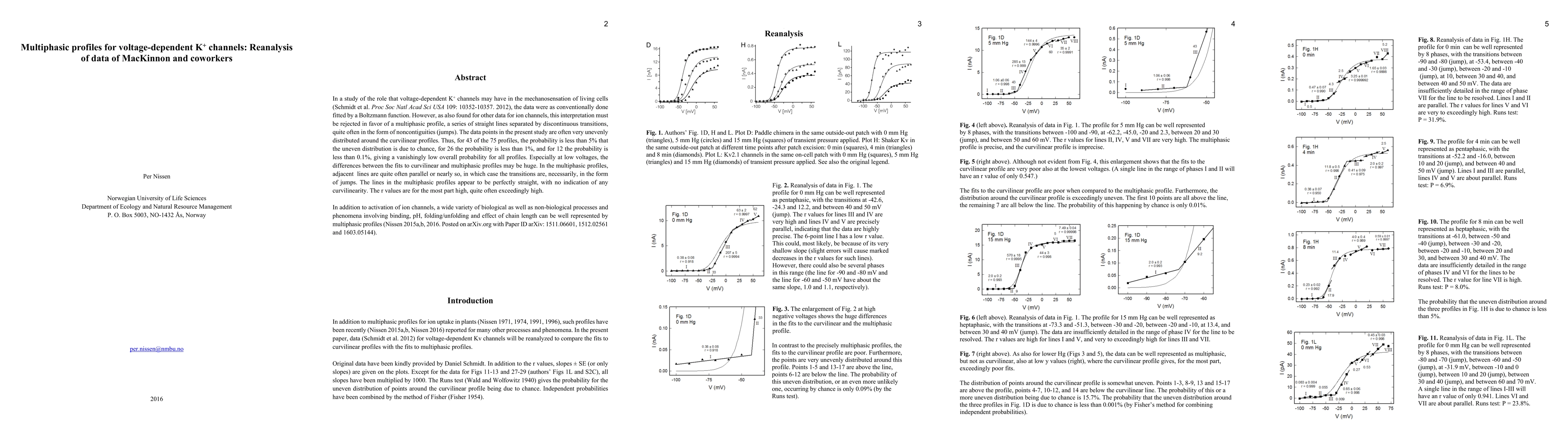 In a study of the role that voltage-dependent K+ channels may have in the mechanosensation of living cells (Schmidt et al. Proc Soc Natl Acad Sci USA 109: 10352-10357. 2012), the data were as conventionally done fitted by a Boltzmann function. However, as also found for other data for ion channels, this interpretation must be rejected in favor of a multiphasic profile, a series of straight lines separated by discontinuous transitions, quite often in the form of noncontiguities (jumps). The data points in the present study are often very unevenly distributed around the curvilinear profiles. Thus, for 43 of the 75 profiles, the probability is less than 5% that the uneven distribution is due to chance, for 26 the probability is less than 1%, and for 12 the probability is less than 0.1%, giving a vanishingly low overall probability for all profiles. Especially at low voltages, the differences between the fits to curvilinear and multiphasic profiles may be huge. In the multiphasic profiles, adjacent lines are quite often parallel or nearly so, in which case the transitions are, necessarily, in the form of jumps. The lines in the multiphasic profiles appear to be perfectly straight, with no indication of any curvilinearity. The r values are for the most part high, quite often exceedingly high. In addition to activation of ion channels, a wide variety of biological as well as non-biological processes and phenomena involving binding, pH, folding/unfolding and effect of chain length can be well represented by multiphasic profiles (Nissen 2015a,b, 2016. Posted on arXiv.org with Paper ID arXiv: 1511.06601, 1512.02561 and 1603.05144). Introduction