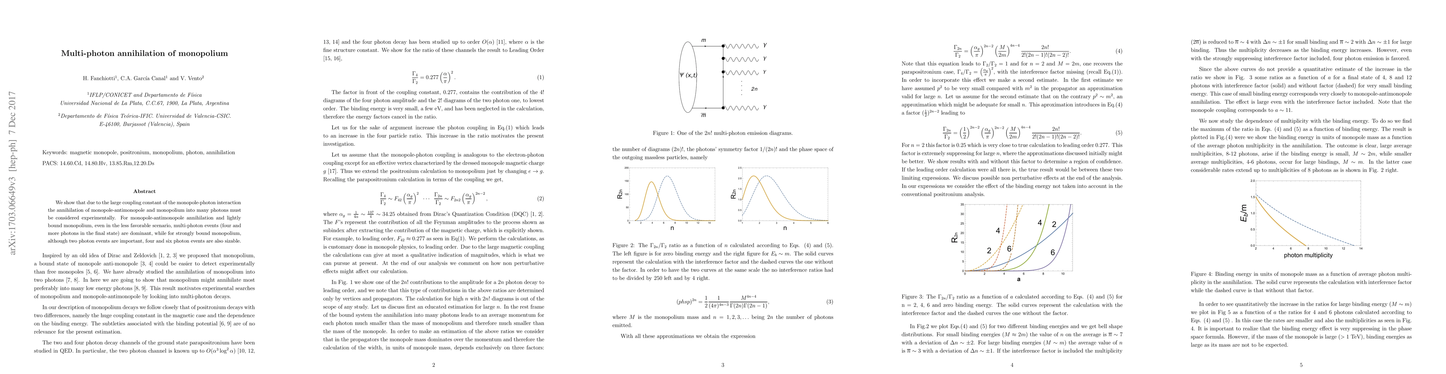 This paper explores the annihilation of monopole-antimonopole pairs and monopolium into multiple photons due to strong monopole-photon interactions. It finds that multi-photon events, especially those with four or more photons, dominate the final states, particularly for lightly bound monopolium.