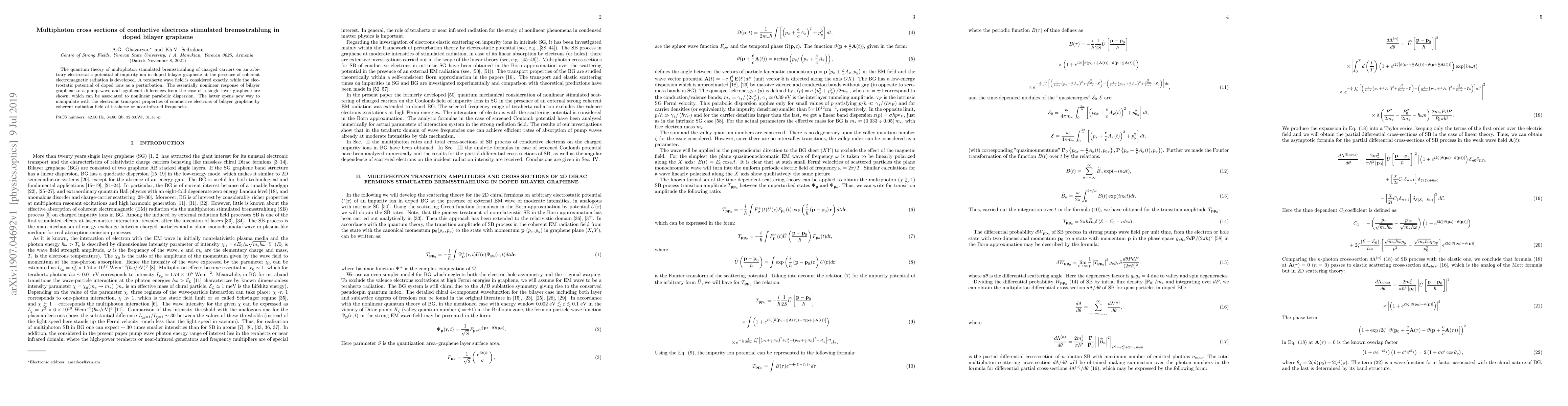 The quantum theory of multiphoton stimulated bremsstrahlung of charged carriers on an arbitrary electrostatic potential of impurity ion in doped bilayer graphene at the presence of coherent electromagnetic radiation is developed. A terahertz wave field is considered exactly, while the electrostatic potential of doped ions as a perturbation. The essentially nonlinear response of bilayer graphene to a pump wave and significant differences from the case of a single layer graphene are shown, which can be associated to nonlinear parabolic dispersion. The latter opens new way to manipulate with the electronic transport properties of conductive electrons of bilayer graphene by coherent radiation field of terahertz or near-infrared frequencies.