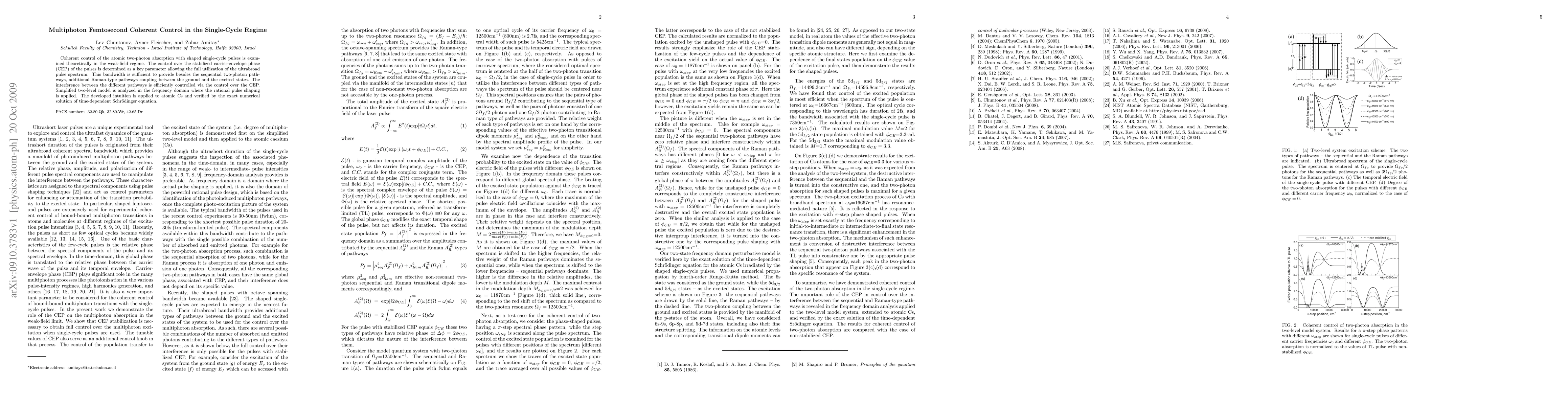 This paper explores the theoretical control of atomic two-photon absorption using shaped single-cycle femtosecond pulses, emphasizing the importance of carrier-envelope phase (CEP) for optimal pulse spectrum utilization. The study demonstrates how CEP control can manipulate interference between sequential and Raman-type pathways, validated through a simplified two-level model and exact numerical solutions of the time-dependent Schrödinger equation for atomic Cs.