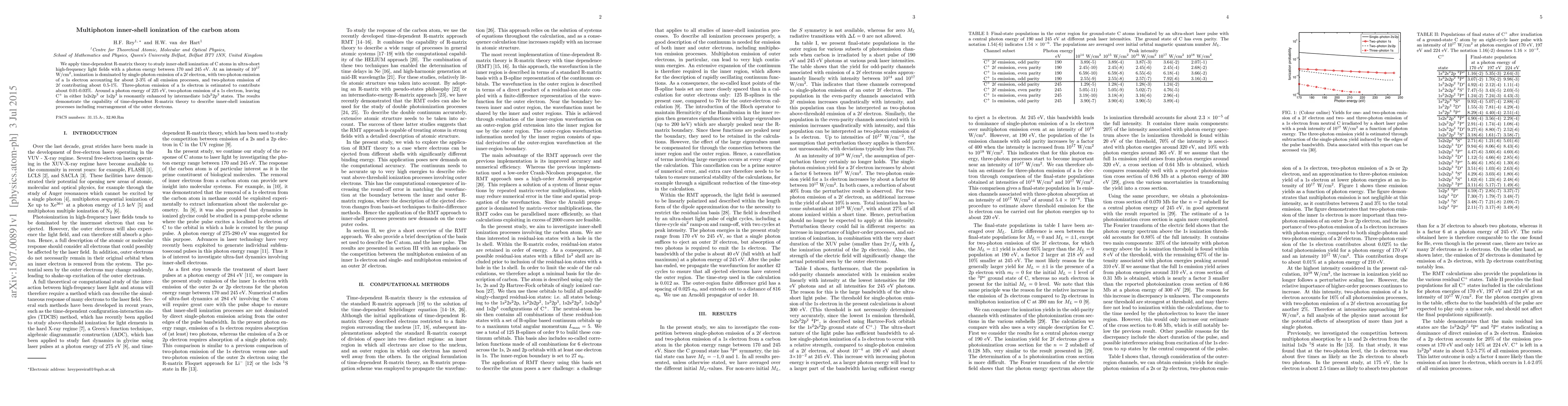 We apply time-dependent R-matrix theory to study inner-shell ionization of C atoms in ultra-short high-frequency light fields with a photon energy between 170 and 245 eV. At an intensity of 10$^{17}$ W/cm$^2$, ionization is dominated by single-photon emission of a $2\ell$ electron, with two-photon emission of a 1s electron accounting for about 2-3\% of all emission processes, and two-photon emission of $2\ell$ contributing about 0.5-1\%. Three-photon emission of a 1s electron is estimated to contribute about 0.01-0.03\%. Around a photon energy of 225 eV, two-photon emission of a 1s electron, leaving C$^+$ in either 1s2s2p$^3$ or 1s2p$^4$ is resonantly enhanced by intermediate 1s2s$^2$2p$^3$ states. The results demonstrate the capability of time-dependent R-matrix theory to describe inner-shell ionization processes including rearrangement of the outer electrons.