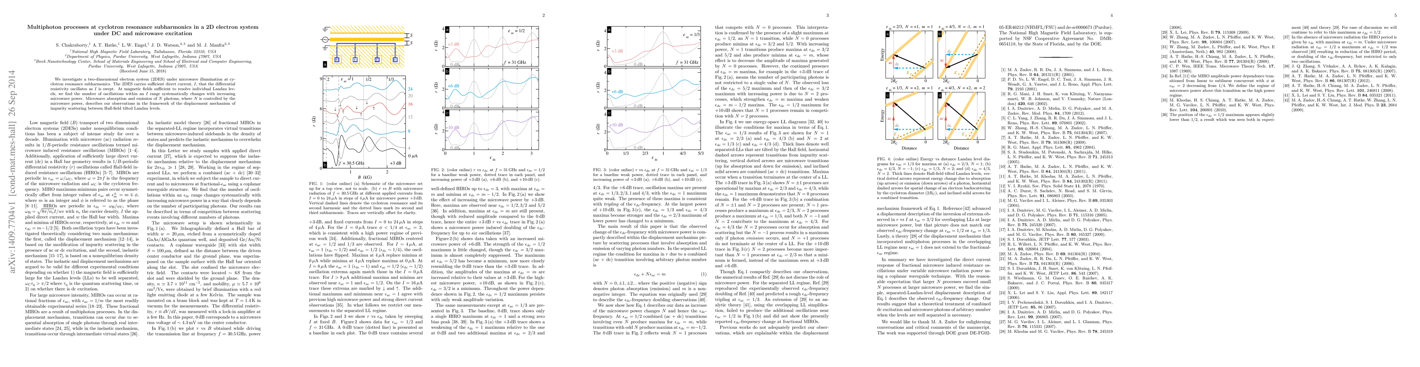 This study explores multiphoton processes in a 2D electron system under microwave excitation at cyclotron resonance subharmonics, revealing that the number of oscillations in differential resistivity varies with microwave power, consistent with $N$-photon absorption/emission mechanisms. The findings align with the displacement mechanism of impurity scattering between tilted Landau levels.
