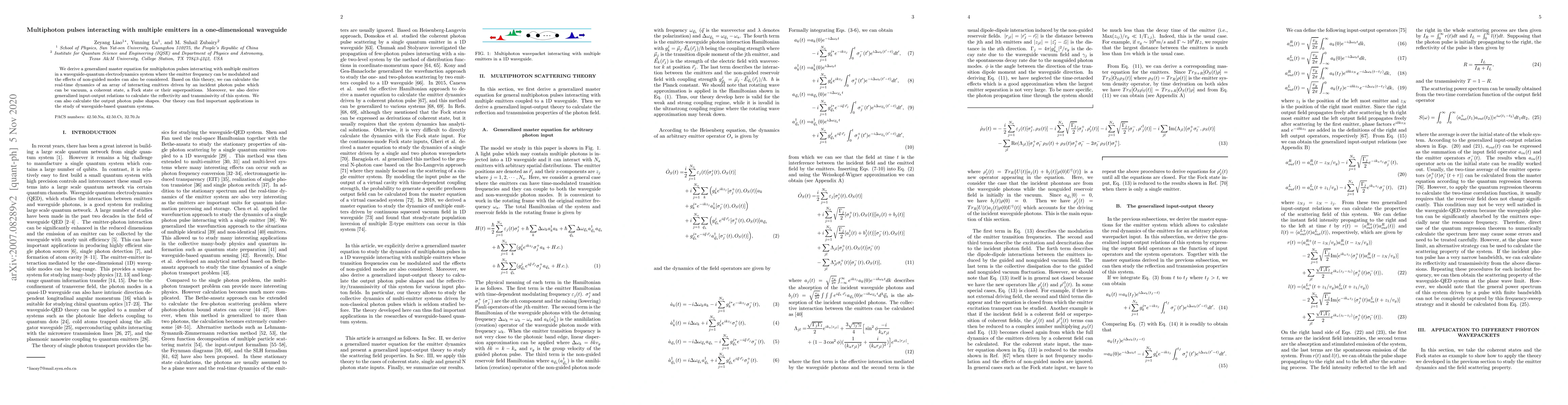 This paper develops a generalized master equation for multiphoton pulses interacting with modulated emitters in a one-dimensional waveguide, considering non-guided modes. It calculates the real-time dynamics of emitter arrays and derives input-output relations for reflectivity, transmissivity, and output pulse shapes, with applications in waveguide-based quantum systems.