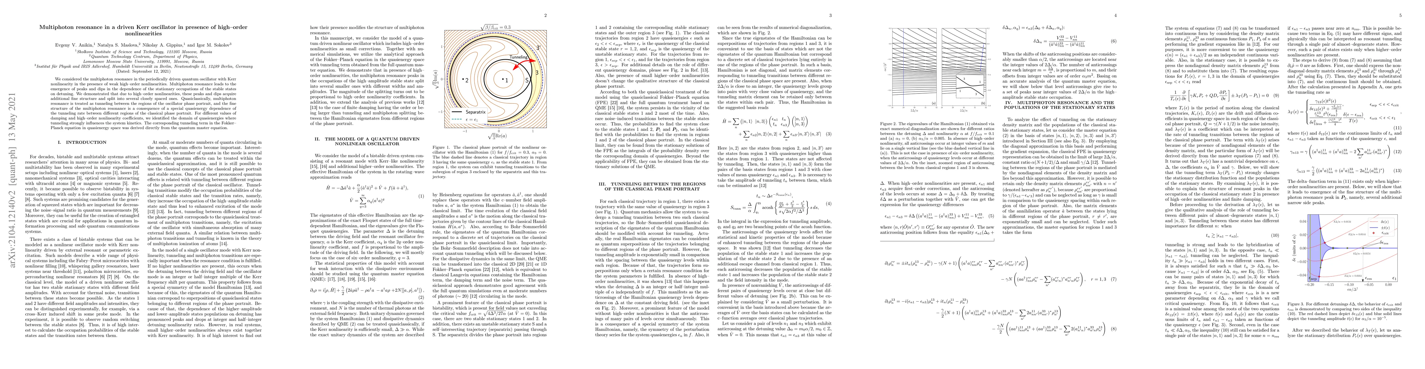 We considered the multiphoton resonance in the periodically driven quantum oscillator with Kerr nonlinearity in the presence of weak high-order nonlinearities. Multiphoton resonance leads to the emergence of peaks and dips in the dependence of the stationary occupations of the stable states on detuning. We demonstrated that due to high-order nonlinearities, these peaks and dips acquire additional fine structure and split into several closely spaced ones. Quasiclassically, multiphoton resonance is treated as tunneling between the regions of the oscillator phase portrait, and the fine structure of the multiphoton resonance is a consequence of a special quasienergy dependence of the tunneling rate between different regions of the classical phase portrait. For different values of damping and high-order nonlinearity coefficients, we identified the domain of quasienergies where tunneling strongly influences the system kinetics. The corresponding tunneling term in the Fokker-Planck equation in quasienergy space was derived directly from the quantum master equation.
