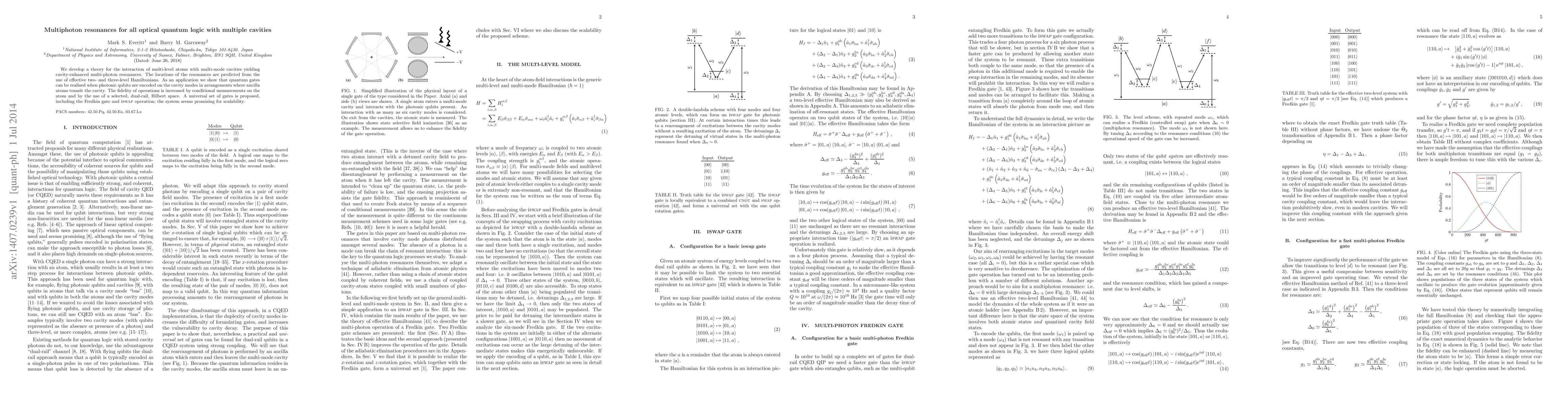 We develop a theory for the interaction of multi-level atoms with multi-mode cavities yielding cavity-enhanced multi-photon resonances. The locations of the resonances are predicted from the use of effective two- and three-level Hamiltonians. As an application we show that quantum gates can be realised when photonic qubits are encoded on the cavity modes in arrangements where ancilla atoms transit the cavity. The fidelity of operations is increased by conditional measurements on the atom and by the use of a selected, dual-rail, Hilbert space. A universal set of gates is proposed, including the Fredkin gate and iSWAP operation; the system seems promising for scalability.