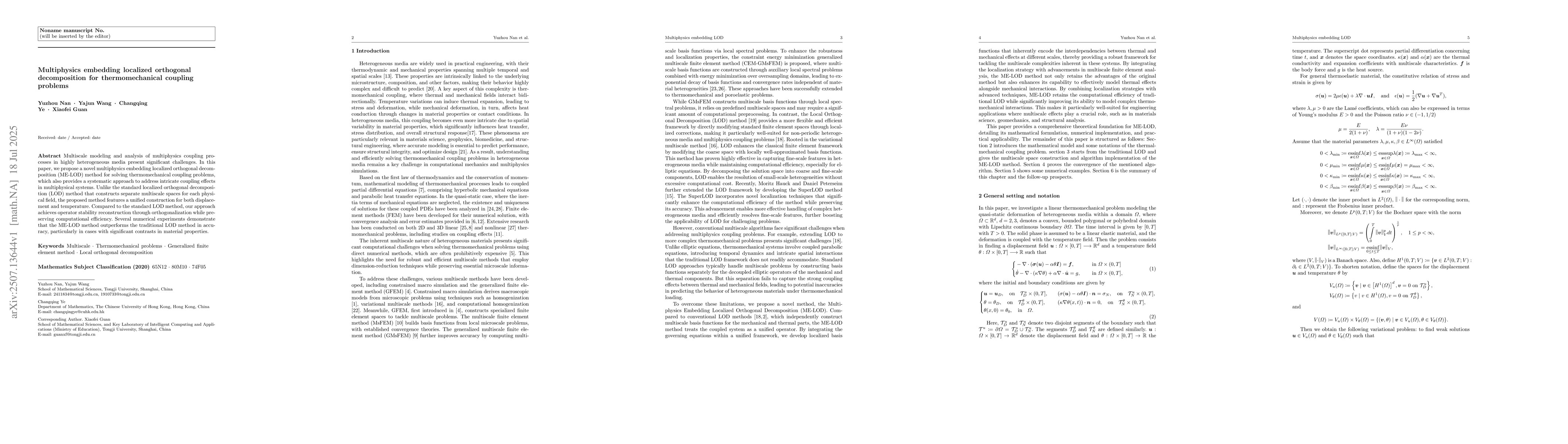 Multiscale modeling and analysis of multiphysics coupling processes in highly heterogeneous media present significant challenges. In this paper, we propose a novel multiphysics embedding localized orthogonal decomposition (ME-LOD) method for solving thermomechanical coupling problems, which also provides a systematic approach to address intricate coupling effects in multiphysical systems. Unlike the standard localized orthogonal decomposition (LOD) method that constructs separate multiscale spaces for each physical field, the proposed method features a unified construction for both displacement and temperature. Compared to the standard LOD method, our approach achieves operator stability reconstruction through orthogonalization while preserving computational efficiency. Several numerical experiments demonstrate that the ME-LOD method outperforms the traditional LOD method in accuracy, particularly in cases with significant contrasts in material properties.