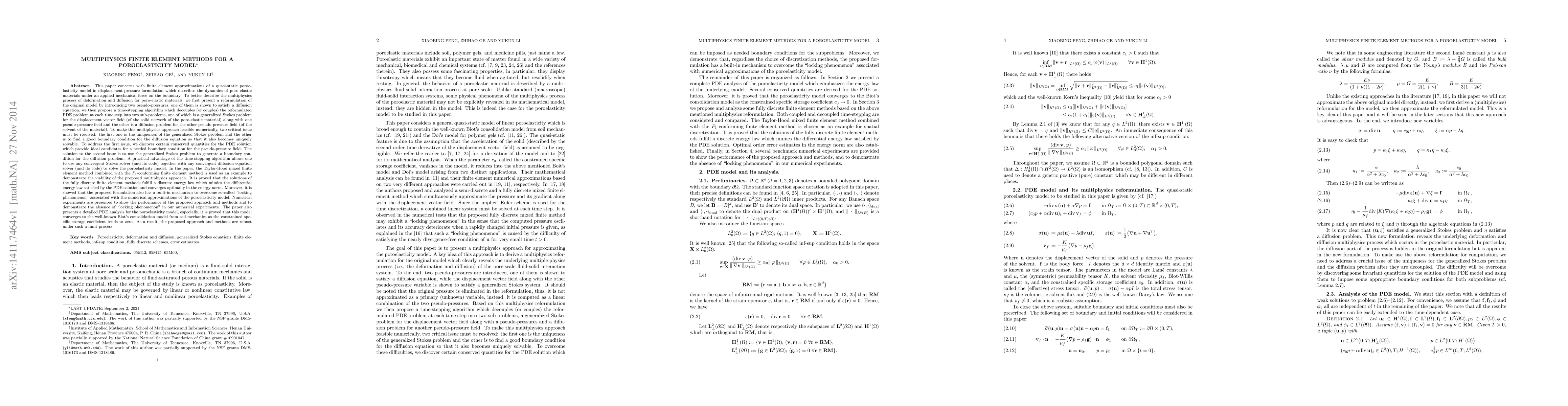 This paper concerns with finite element approximations of a quasi-static poroelasticity model in displacement-pressure formulation which describes the dynamics of poro-elastic materials under an applied mechanical force on the boundary. To better describe the multiphysics process of deformation and diffusion for poro-elastic materials, we first present a reformulation of the original model by introducing two pseudo-pressures, one of them is shown to satisfy a diffusion equation, we then propose a time-stepping algorithm which decouples (or couples) the reformulated PDE problem at each time step into two sub-problems, one of which is a generalized Stokes problem for the displacement vector field (of the solid network of the poro-elastic material) along with one pseudo-pressure field and the other is a diffusion problem for the other pseudo-pressure field (of the solvent of the material). In the paper, the Taylor-Hood mixed finite element method combined with the $P_1$-conforming finite element method is used as an example to demonstrate the viability of the proposed multiphysics approach. It is proved that the solutions of the fully discrete finite element methods fulfill a discrete energy law which mimics the differential energy law satisfied by the PDE solution and converges optimally in the energy norm. Moreover, it is showed that the proposed formulation also has a built-in mechanism to overcome so-called "locking phenomenon" associated with the numerical approximations of the poroelasticity model. Numerical experiments are presented to show the performance of the proposed approach and methods and to demonstrate the absence of "locking phenomenon" in our numerical experiments.