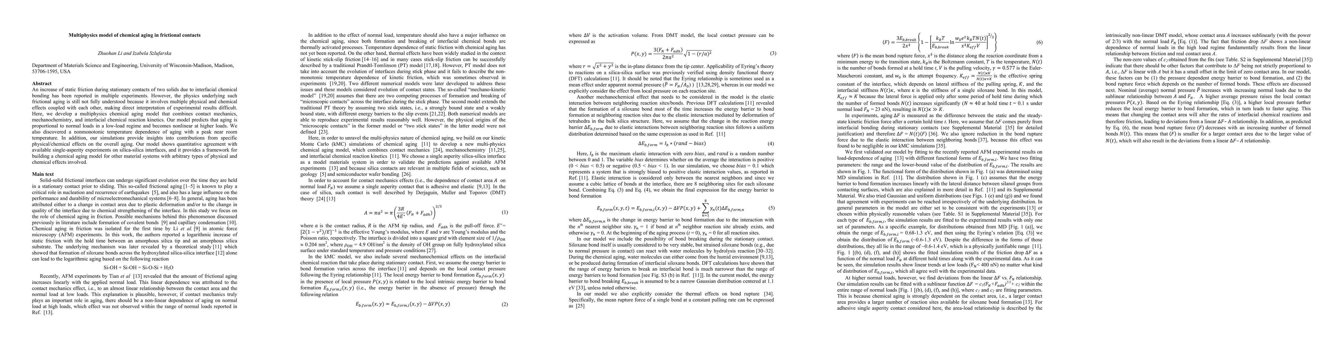 The research develops a multiphysics chemical aging model combining contact mechanics, mechanochemistry, and interfacial chemical reaction kinetics to study frictional aging in solids.