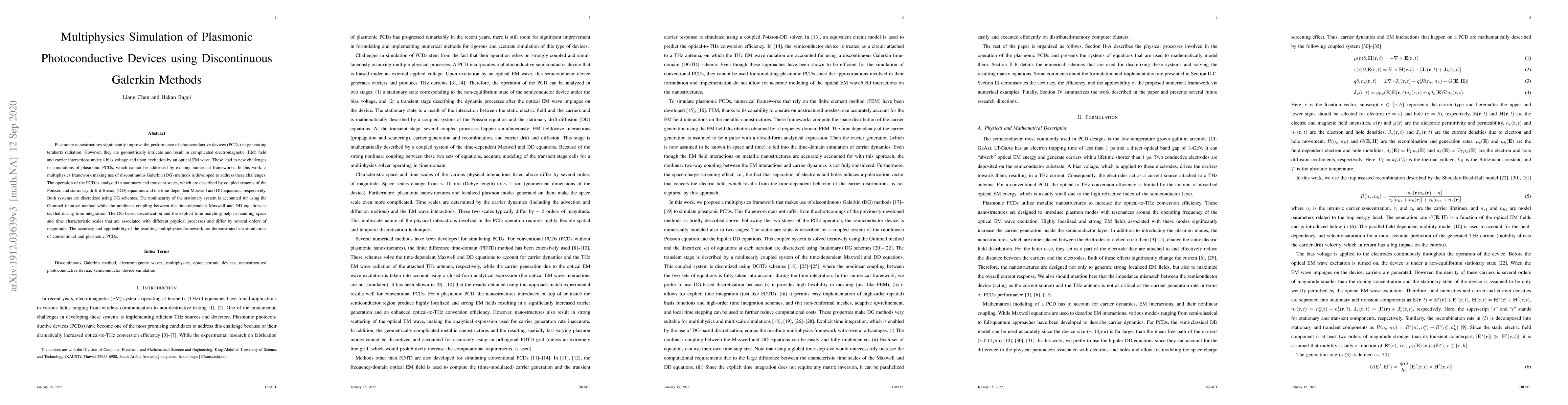 This paper develops a multiphysics simulation framework using discontinuous Galerkin methods to analyze plasmonic photoconductive devices, addressing complex electromagnetic and carrier interactions. The framework accurately models both stationary and transient operations of the devices, demonstrating its effectiveness through simulations of conventional and plasmonic photoconductive devices.