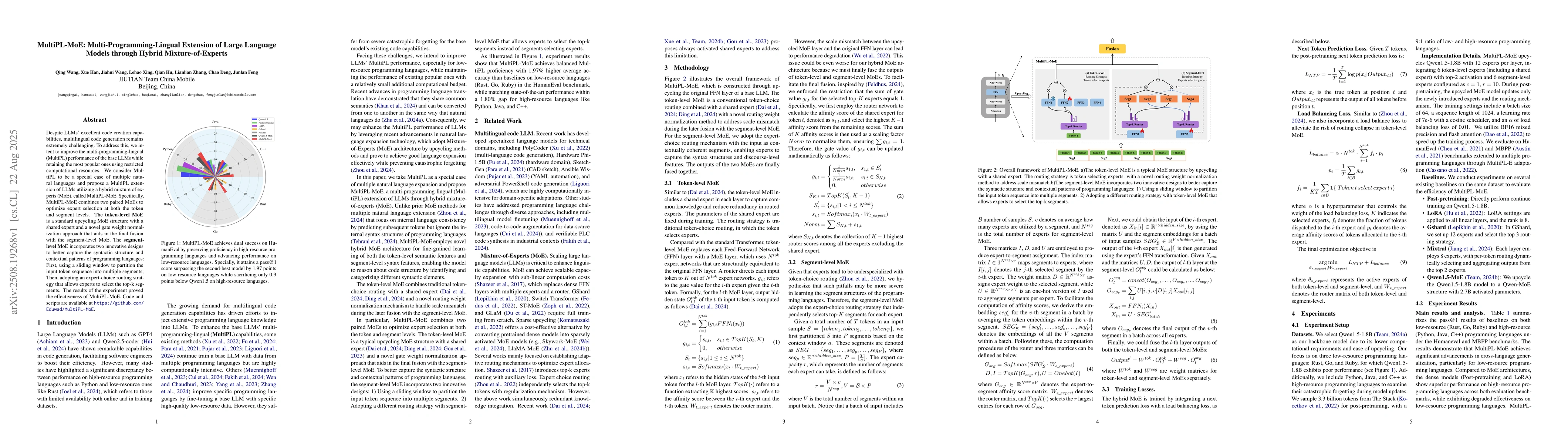 Despite LLMs' excellent code creation capabilities, multilingual code generation remains extremely challenging. To address this, we intent to improve the multi-programming-lingual (MultiPL) performance of the base LLMs while retaining the most popular ones using restricted computational resources. We consider MultiPL to be a special case of multiple natural languages and propose a MultiPL extension of LLMs utilizing a hybrid mixture of experts (MoE), called MultiPL-MoE. Specifically, MultiPL-MoE combines two paired MoEs to optimize expert selection at both the token and segment levels. The token-level MoE is a standard upcycling MoE structure with a shared expert and a novel gate weight normalization approach that aids in the final fusion with the segment-level MoE. The segment-level MoE incorporates two innovative designs to better capture the syntactic structure and contextual patterns of programming languages: First, using a sliding window to partition the input token sequence into multiple segments; Then, adopting an expert-choice routing strategy that allows experts to select the top-k segments. The results of the experiment proved the effectiveness of MultiPL-MoE.