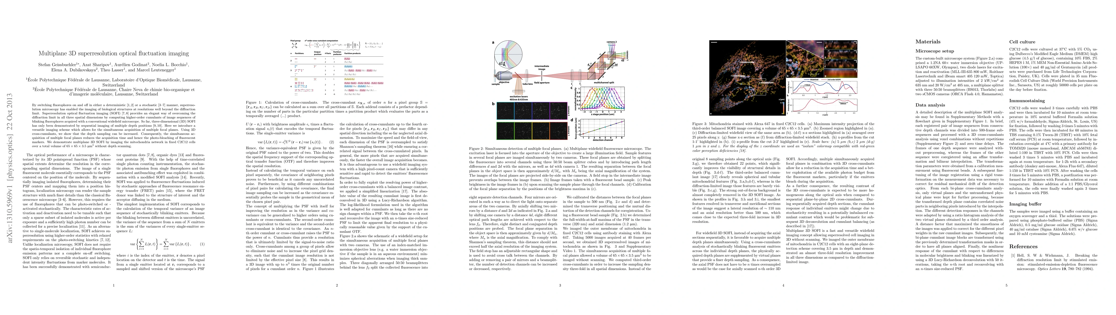 This paper introduces a method for simultaneous multiplane 3D superresolution optical fluctuation imaging (SOFI) that enhances depth sampling and reduces acquisition time and photo-bleaching. The technique uses 3D cross-cumulants to achieve higher resolution imaging of biological structures without sequential depth scanning.