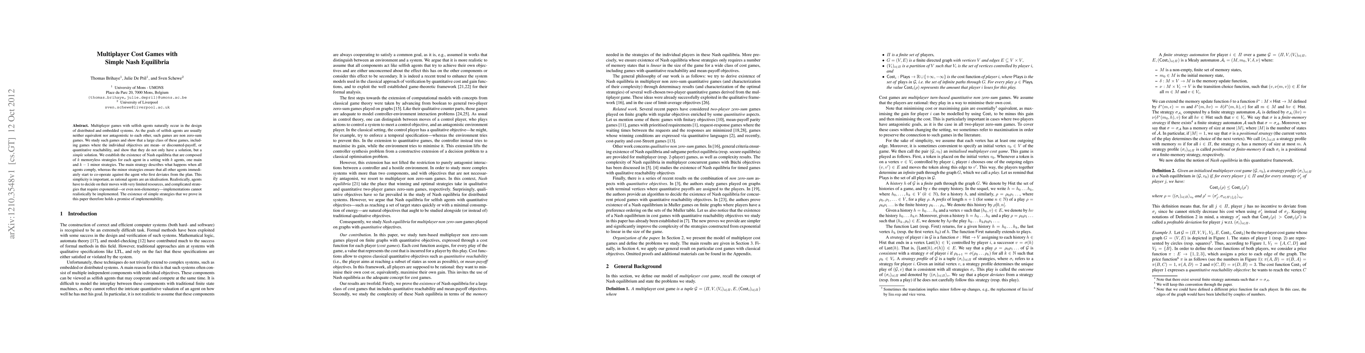 The paper proves the existence of simple Nash equilibria in a large class of multiplayer cost games with selfish agents, ensuring that these equilibria are composed of memoryless strategies.
