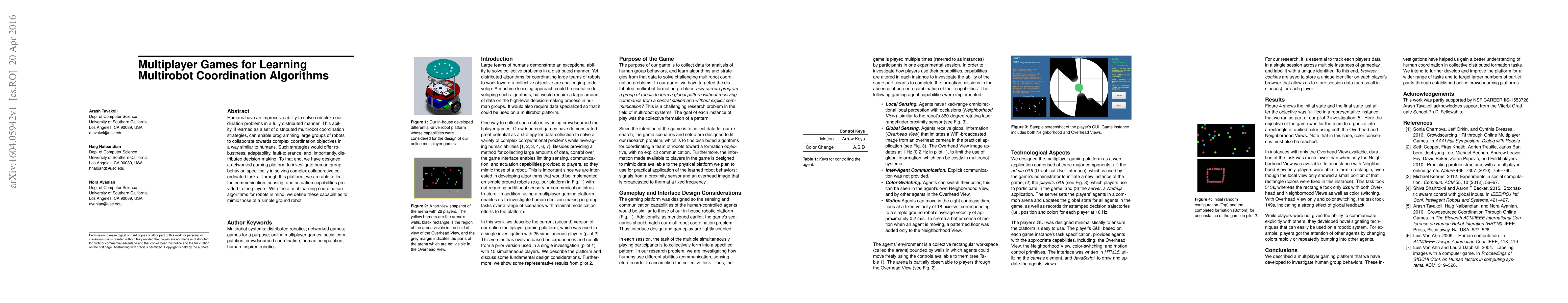 This research explores using multiplayer games to study human group behavior in solving complex coordination tasks, aiming to develop distributed multirobot coordination algorithms that mimic human robustness and adaptability. The study employs a gaming platform to simulate robot-like communication, sensing, and actuation constraints.
