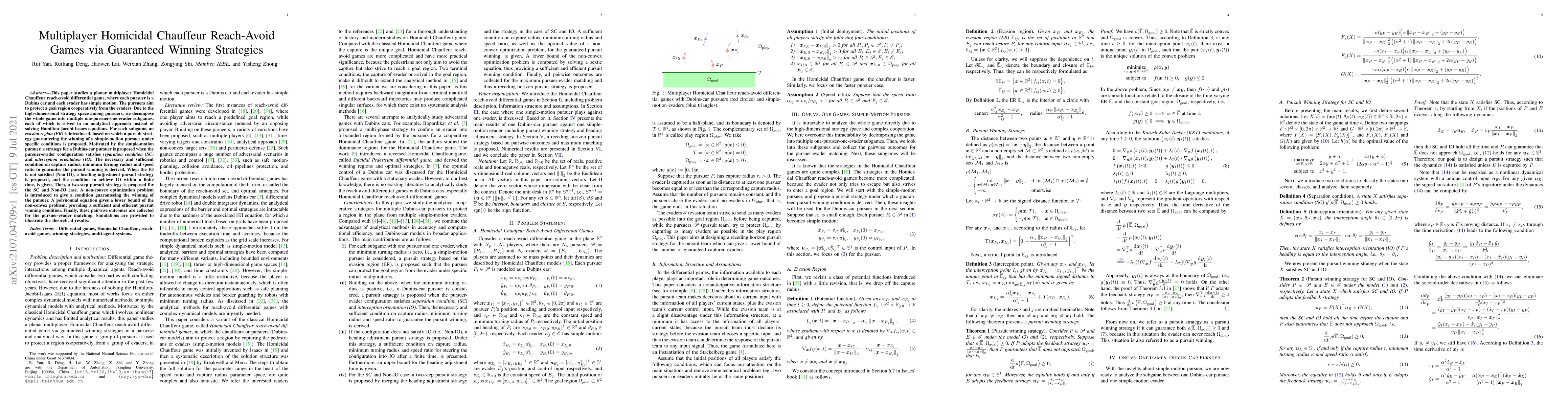 This paper decomposes a multiplayer planar Homicidal Chauffeur reach-avoid game into simpler subgames, solving each analytically to develop guaranteed winning strategies for pursuers, including Dubins cars, against evaders. It introduces conditions and strategies for pursuit success under various configurations and provides a polynomial equation to efficiently determine winning conditions.