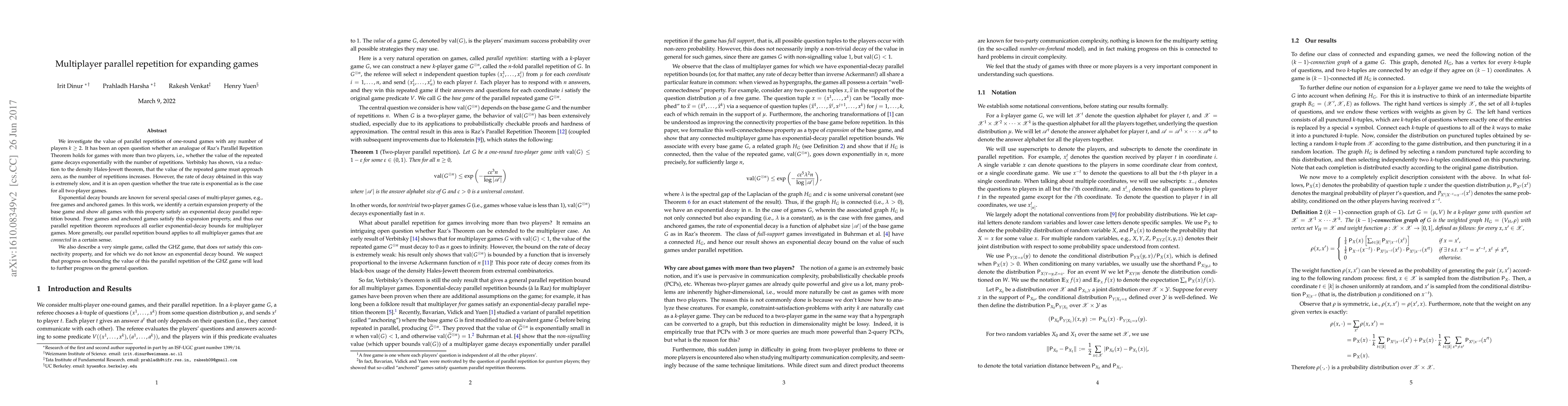 We investigate the value of parallel repetition of one-round games with any number of players $k\ge 2$. It has been an open question whether an analogue of Raz's Parallel Repetition Theorem holds for games with more than two players, i.e., whether the value of the repeated game decays exponentially with the number of repetitions. Verbitsky has shown, via a reduction to the density Hales-Jewett theorem, that the value of the repeated game must approach zero, as the number of repetitions increases. However, the rate of decay obtained in this way is extremely slow, and it is an open question whether the true rate is exponential as is the case for all two-player games. Exponential decay bounds are known for several special cases of multi-player games, e.g., free games and anchored games. In this work, we identify a certain expansion property of the base game and show all games with this property satisfy an exponential decay parallel repetition bound. Free games and anchored games satisfy this expansion property, and thus our parallel repetition theorem reproduces all earlier exponential-decay bounds for multiplayer games. More generally, our parallel repetition bound applies to all multiplayer games that are connected in a certain sense. We also describe a very simple game, called the GHZ game, that does not satisfy this connectivity property, and for which we do not know an exponential decay bound. We suspect that progress on bounding the value of this the parallel repetition of the GHZ game will lead to further progress on the general question.