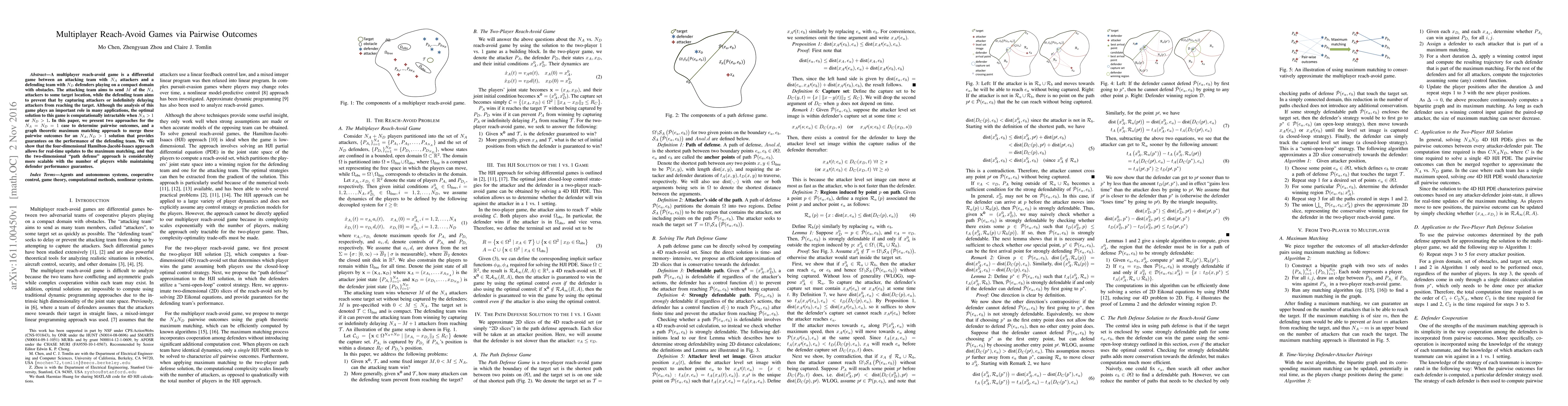 A multiplayer reach-avoid game is a differential game between an attacking team with NA attackers and a defending team with ND defenders playing on a compact domain with obstacles. The attacking team aims to send M of the NA attackers to some target location, while the defending team aims to prevent that by capturing attackers or indefinitely delaying attackers from reaching the target. Although the analysis of this game plays an important role in many applications, the optimal solution to this game is computationally intractable when NA>1 or ND>1. In this paper, we present two approaches for the NA=ND=1 case to determine pairwise outcomes, and a graph theoretic maximum matching approach to merge these pairwise outcomes for an NA,ND>1 solution that provides guarantees on the performance of the defending team. We will show that the four-dimensional Hamilton-Jacobi-Isaacs approach allows for real-time updates to the maximum matching, and that the two-dimensional "path defense" approach is considerably more scalable with the number of players while maintaining defender performance guarantees.