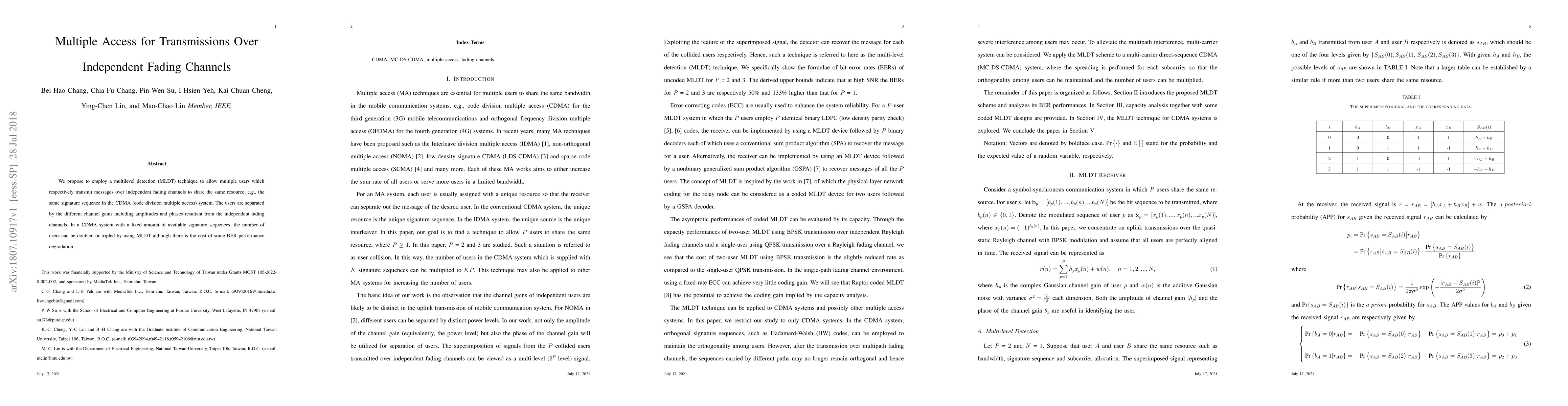 We propose to employ a multilevel detection (MLDT) technique to allow multiple users which respectively transmit messages over independent fading channels to share the same resource, e.g., the same signature sequence in the CDMA (code division multiple access) system. The users are separated by the different channel gains including amplitudes and phases resultant from the independent fading channels. In a CDMA system with a fixed amount of available signature sequences, the number of users can be doubled or tripled by using MLDT although there is the cost of some BER performance degradation.