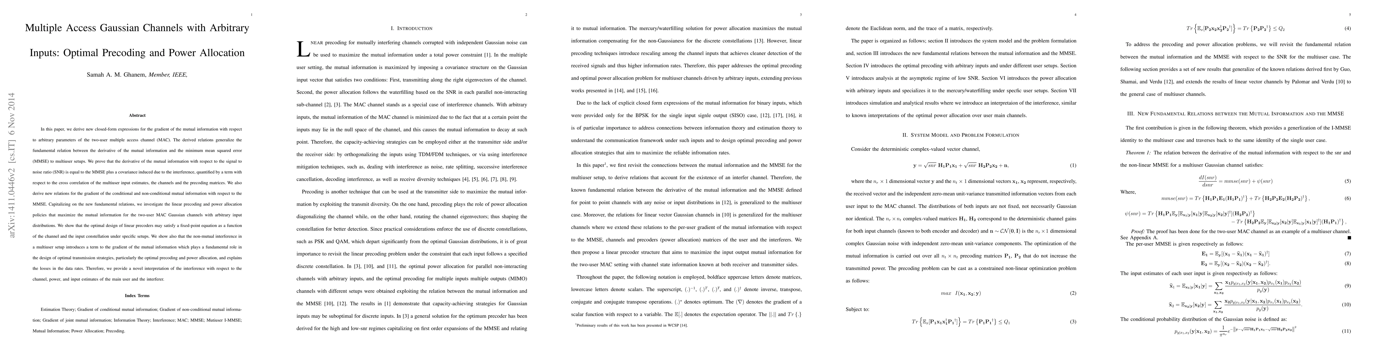In this paper, we derive new closed-form expressions for the gradient of the mutual information with respect to arbitrary parameters of the two-user multiple access channel (MAC). The derived relations generalize the fundamental relation between the derivative of the mutual information and the minimum mean squared error (MMSE) to multiuser setups. We prove that the derivative of the mutual information with respect to the signal to noise ratio (SNR) is equal to the MMSE plus a covariance induced due to the interference, quantified by a term with respect to the cross correlation of the multiuser input estimates, the channels and the precoding matrices. We also derive new relations for the gradient of the conditional and non-conditional mutual information with respect to the MMSE. Capitalizing on the new fundamental relations, we investigate the linear precoding and power allocation policies that maximize the mutual information for the two-user MAC Gaussian channels with arbitrary input distributions. We show that the optimal design of linear precoders may satisfy a fixed-point equation as a function of the channel and the input constellation under specific setups. We show also that the non-mutual interference in a multiuser setup introduces a term to the gradient of the mutual information which plays a fundamental role in the design of optimal transmission strategies, particularly the optimal precoding and power allocation, and explains the losses in the data rates. Therefore, we provide a novel interpretation of the interference with respect to the channel, power, and input estimates of the main user and the interferer.