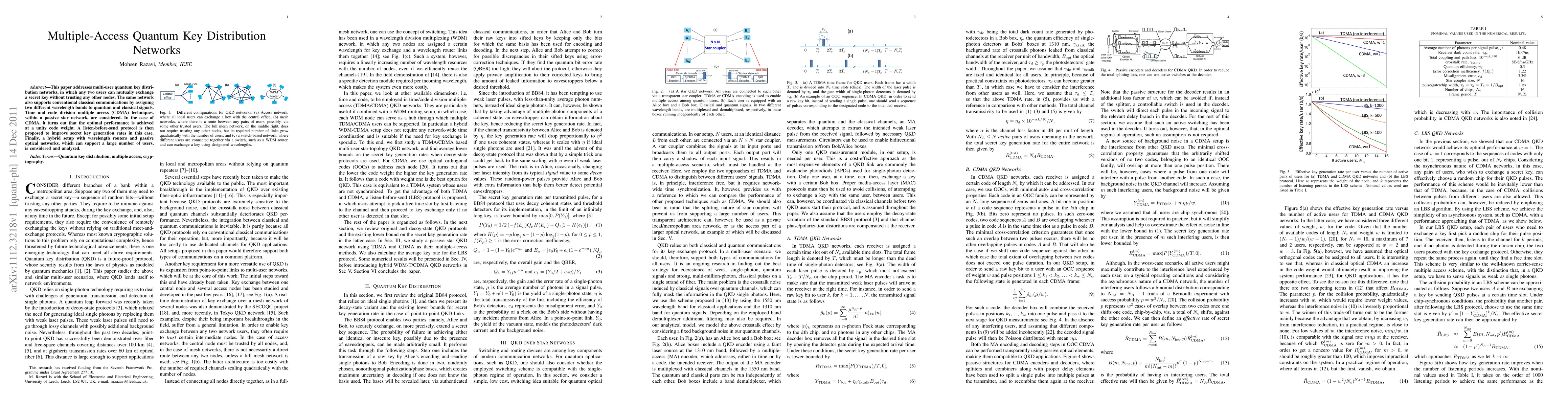This paper explores multi-user quantum key distribution networks allowing secure key exchange between any two users without reliance on other nodes, alongside supporting classical communications. It evaluates time and code division multiple access techniques within a passive star network, proposing a listen-before-send protocol to enhance secret key generation rates.