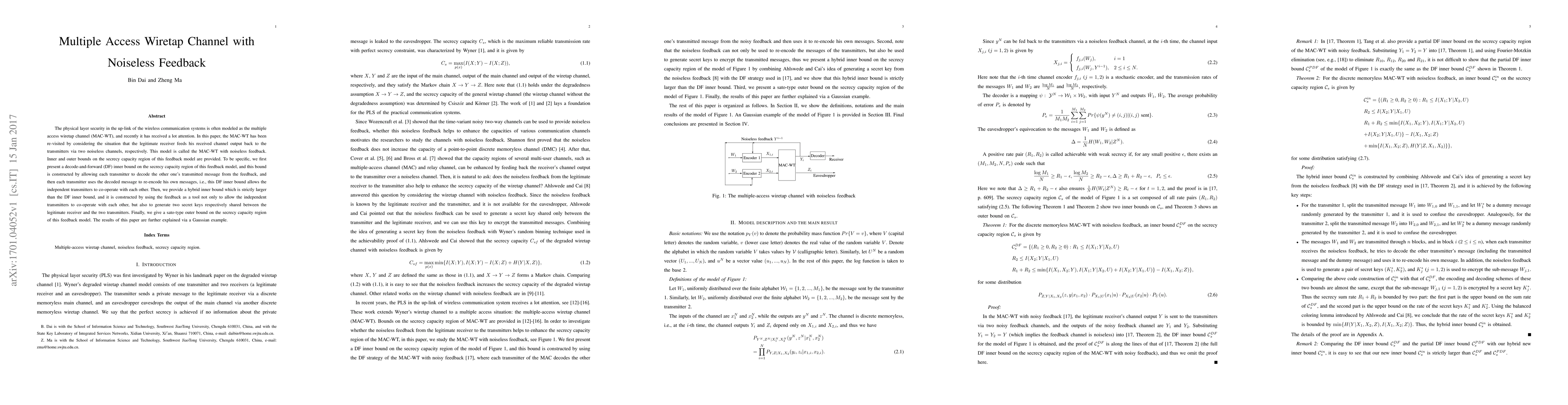 The physical layer security in the up-link of the wireless communication systems is often modeled as the multiple access wiretap channel (MAC-WT), and recently it has received a lot attention. In this paper, the MAC-WT has been re-visited by considering the situation that the legitimate receiver feeds his received channel output back to the transmitters via two noiseless channels, respectively. This model is called the MAC-WT with noiseless feedback. Inner and outer bounds on the secrecy capacity region of this feedback model are provided. To be specific, we first present a decode-and-forward (DF) inner bound on the secrecy capacity region of this feedback model, and this bound is constructed by allowing each transmitter to decode the other one's transmitted message from the feedback, and then each transmitter uses the decoded message to re-encode his own messages, i.e., this DF inner bound allows the independent transmitters to co-operate with each other. Then, we provide a hybrid inner bound which is strictly larger than the DF inner bound, and it is constructed by using the feedback as a tool not only to allow the independent transmitters to co-operate with each other, but also to generate two secret keys respectively shared between the legitimate receiver and the two transmitters. Finally, we give a sato-type outer bound on the secrecy capacity region of this feedback model. The results of this paper are further explained via a Gaussian example.