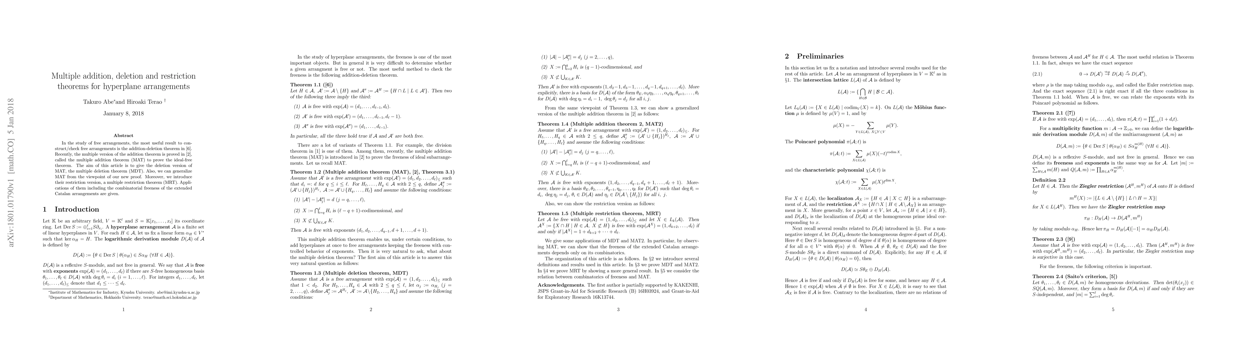 This paper presents the multiple deletion theorem (MDT) and a generalized multiple addition theorem (MAT), along with a multiple restriction theorem (MRT). It applies these theorems to demonstrate the combinatorial freeness of extended Catalan arrangements.