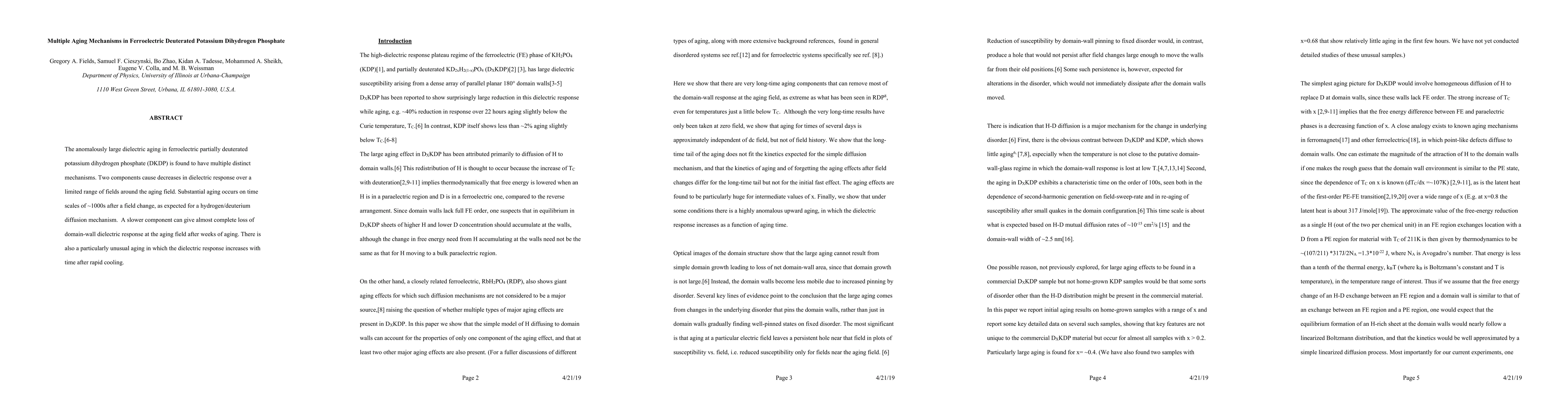 The paper investigates the complex aging mechanisms of ferroelectric deuterated potassium dihydrogen phosphate (DKDP), identifying two components: a rapid hydrogen/deuterium diffusion-related decrease and a slower, complete loss of domain-wall response over weeks, alongside an unusual increase in dielectric response post-cooling.